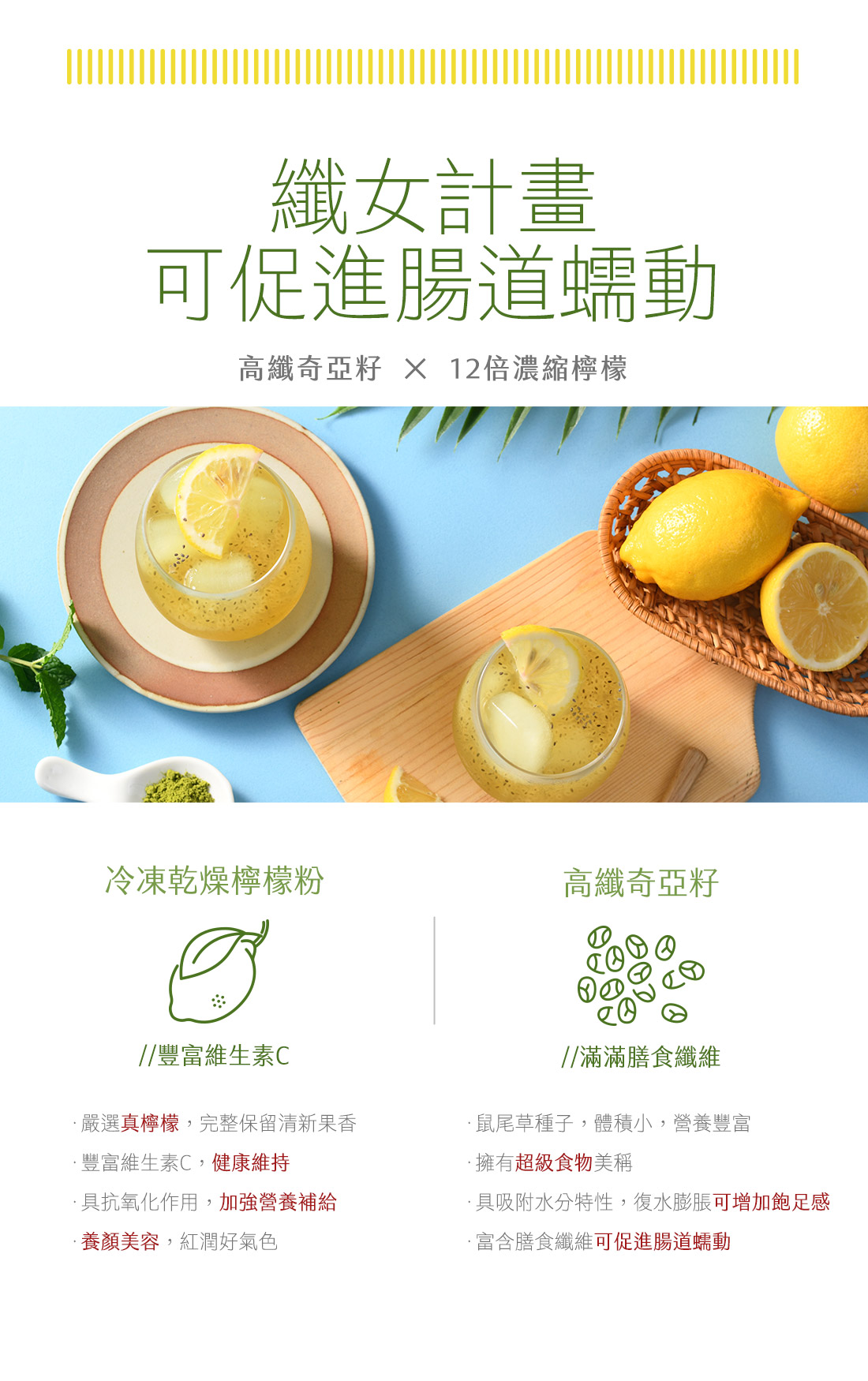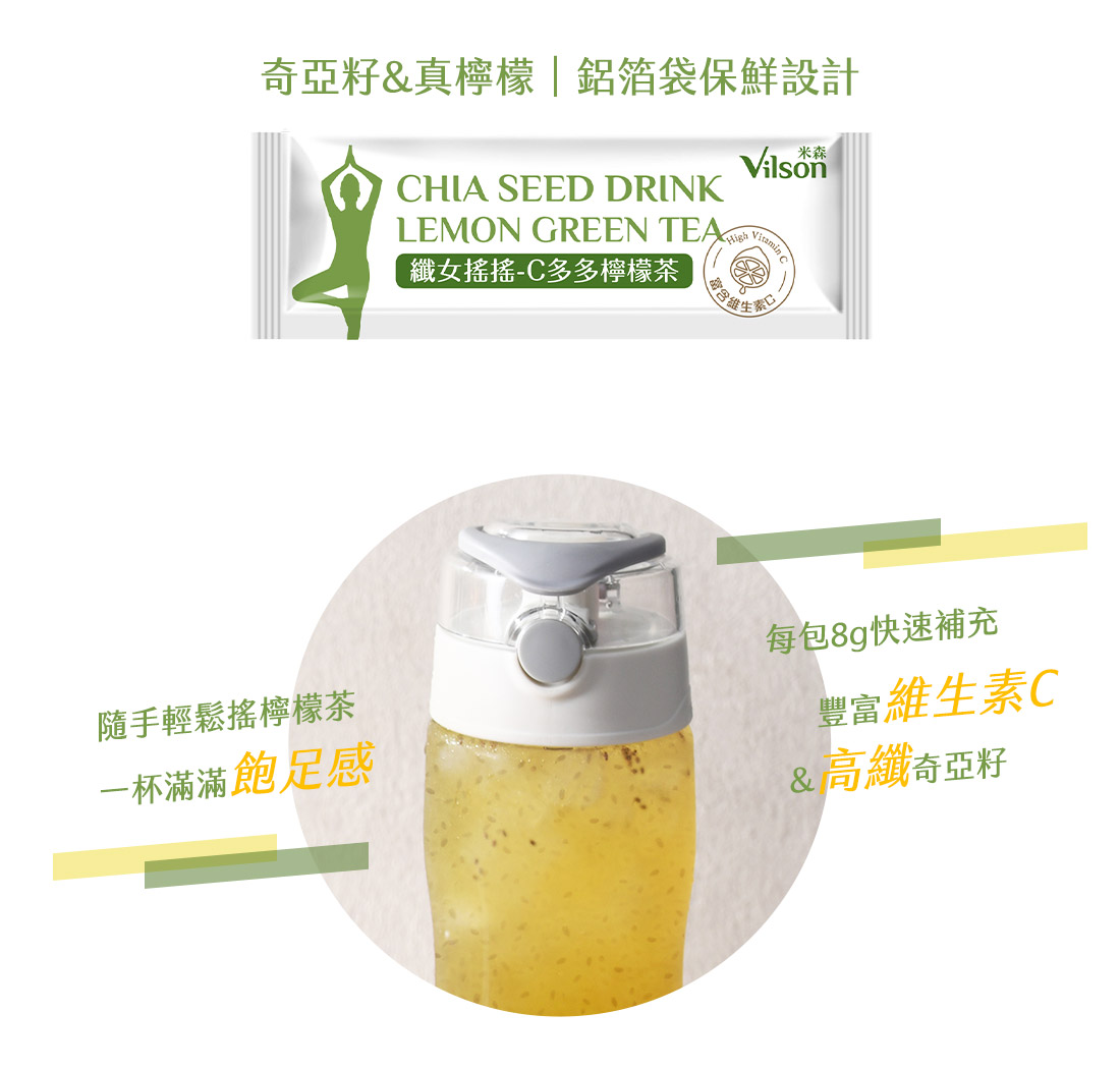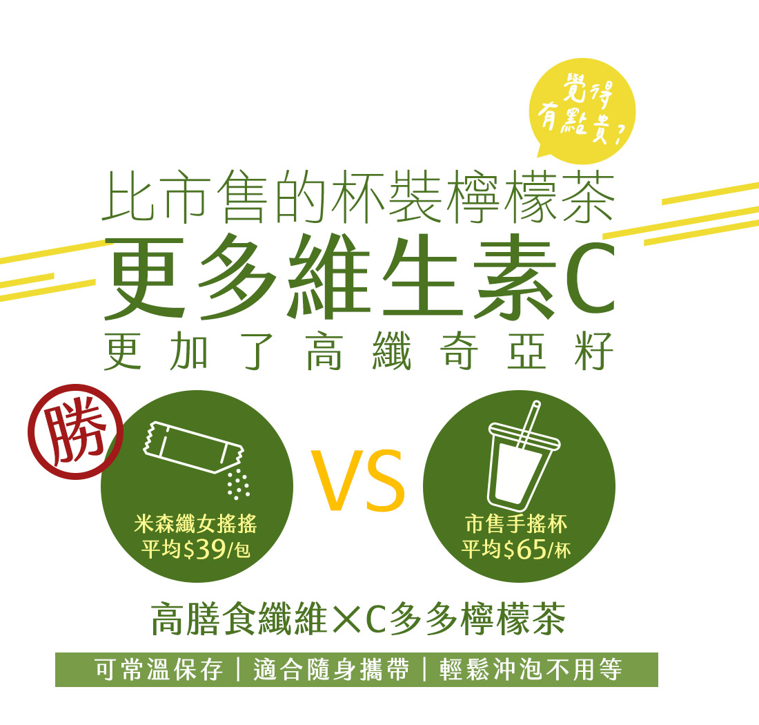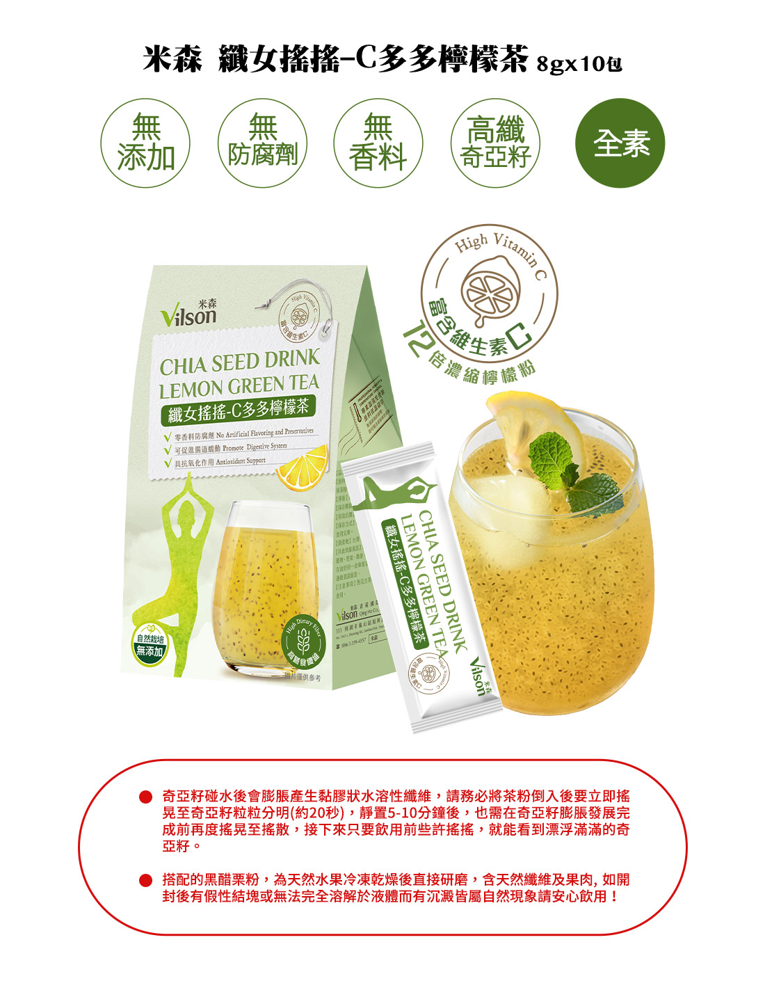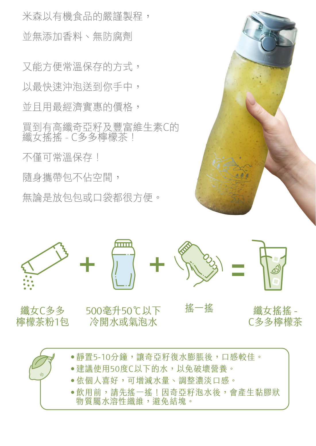 米森選用高纖奇亞籽,營養豐富的超級食物,具有吸附水分的特性,腹水膨脹後可直接食用,增加飽足感,具富含膳食纖維,可促進腸道蠕動,再搭配12倍濃縮檸檬粉,堅持自然無添加,富含維生素C,具抗氧化作用,養顏美容,一天一杯輕鬆補給每日所需營養。