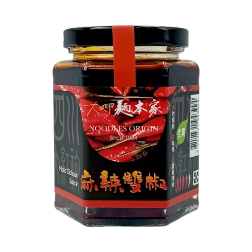 成分:葵花油、辣椒粉、麻油、植物性調味料 (含海鹽、葡萄糖、醬油粉、歐芹粉、百里香粉、香草粉、大豆酵素)、鹽、豆瓣醬、蔗糖、青花椒粉、大紅袍粉、八角、桂皮、甘草粉、小茴、丁香、草果