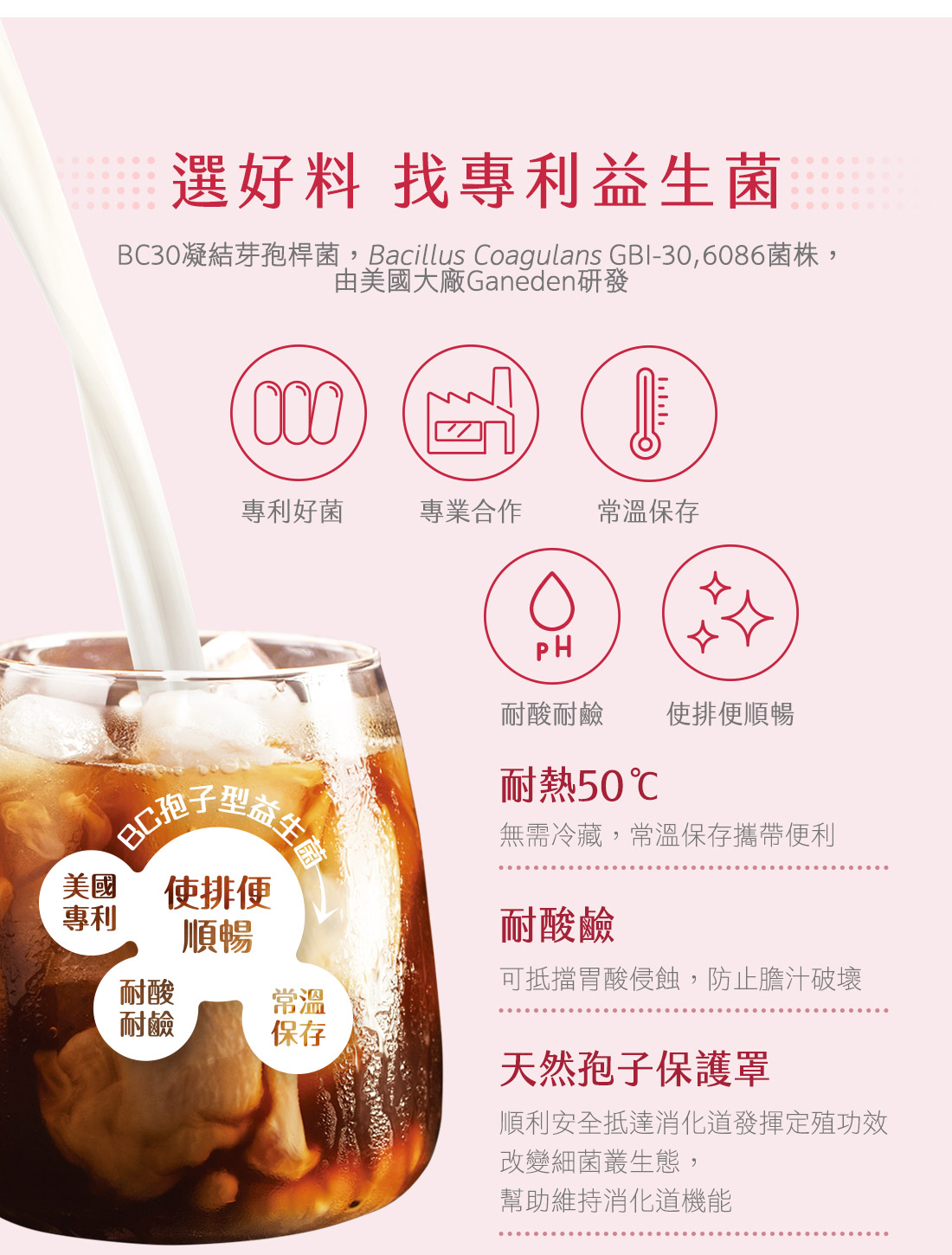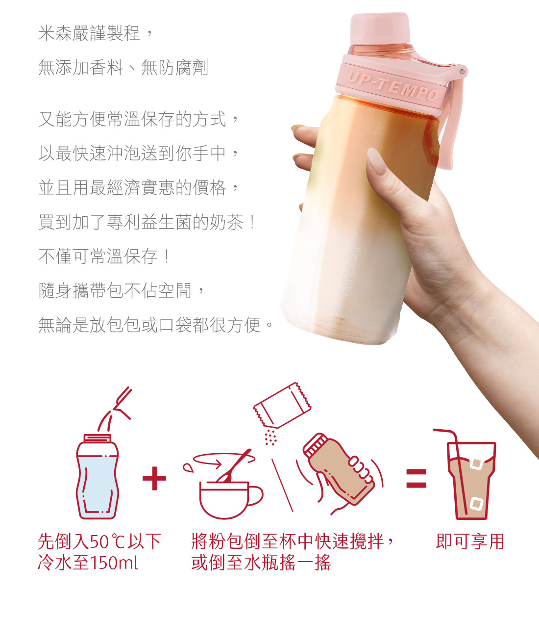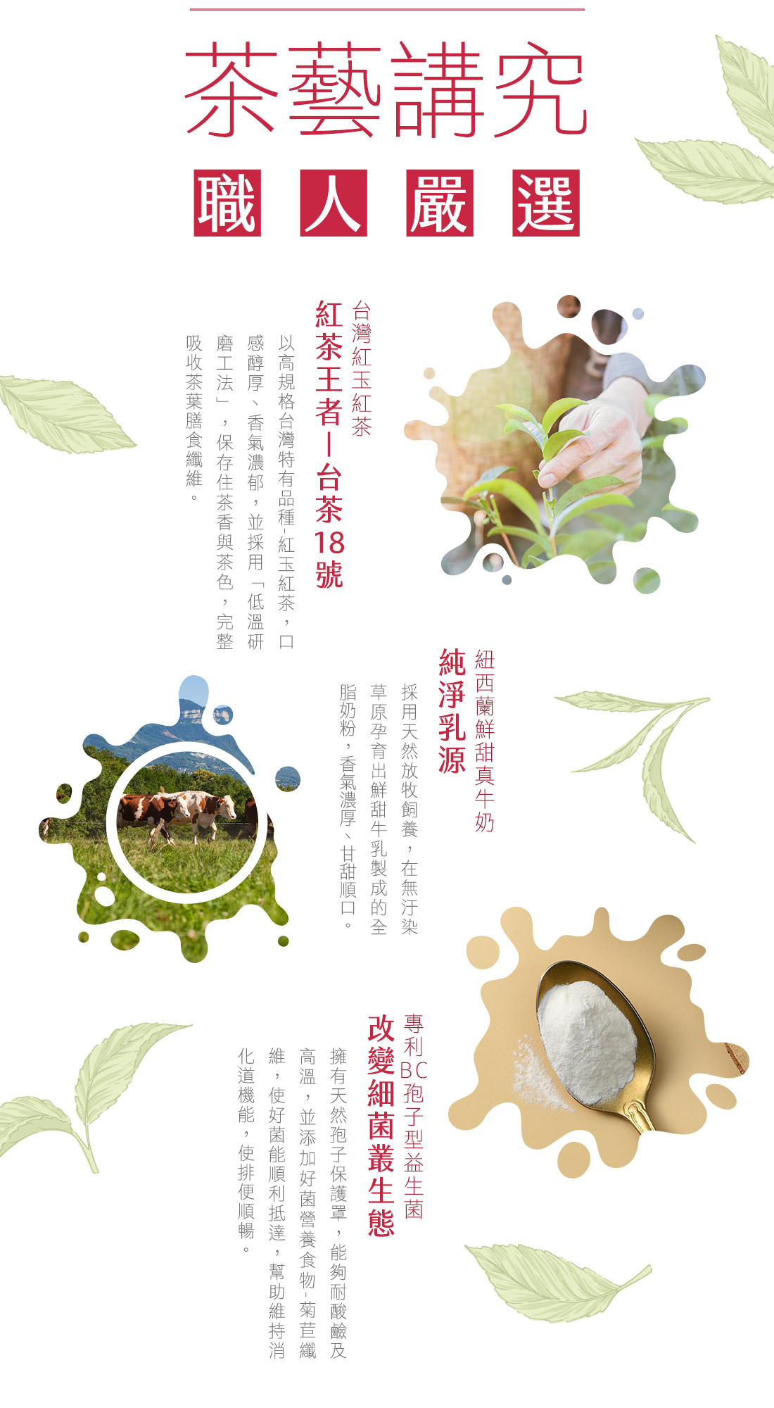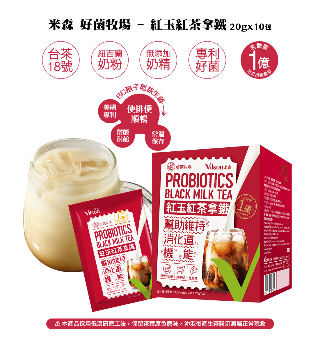米森選用美國大廠研發BC30凝結芽孢桿菌,其專利好菌耐酸鹼及高溫,可以順利抵達腸道發揮定殖功效,再搭配台灣紅玉紅茶及紐西蘭全脂奶粉,圓潤滑順好滋味,促進新陳代謝,幫助維持消化道機能,使排便順暢