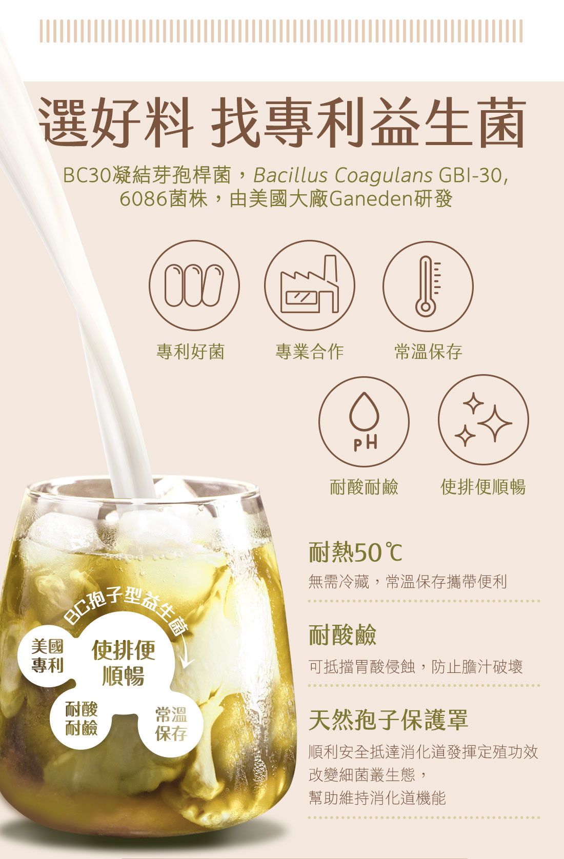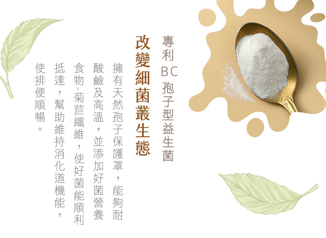 米森選用美國大廠研發BC30凝結芽孢桿菌,其專利好菌耐酸鹼及高溫,可以順利抵達腸道發揮定殖功效,再搭配台灣烏龍茶及紐西蘭全脂奶粉,獨特焙香氣,輕盈濃郁,促進新陳代謝,幫助維持消化道機能,使排便順暢。