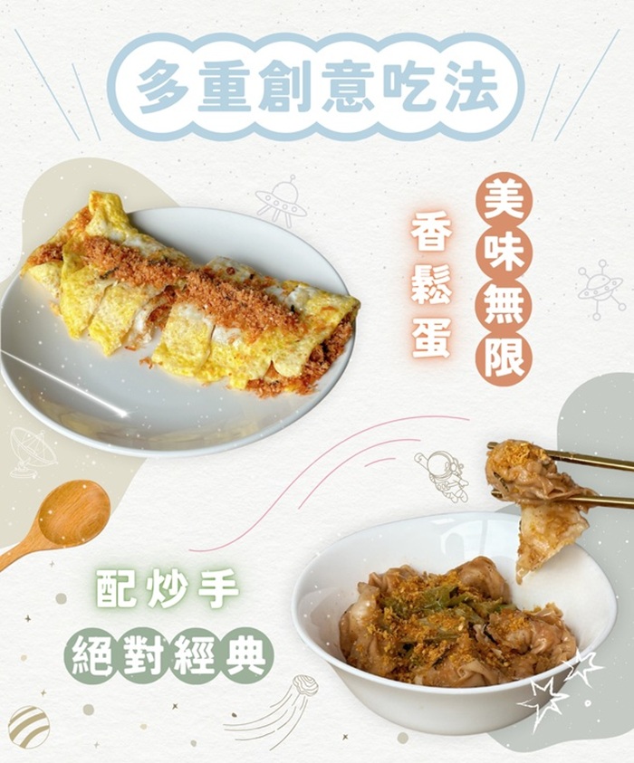 可作為零食或飯糰、壽司、手卷、春捲、白飯、粥品、麵品、夾土司、饅頭、三明治、佐餐等。