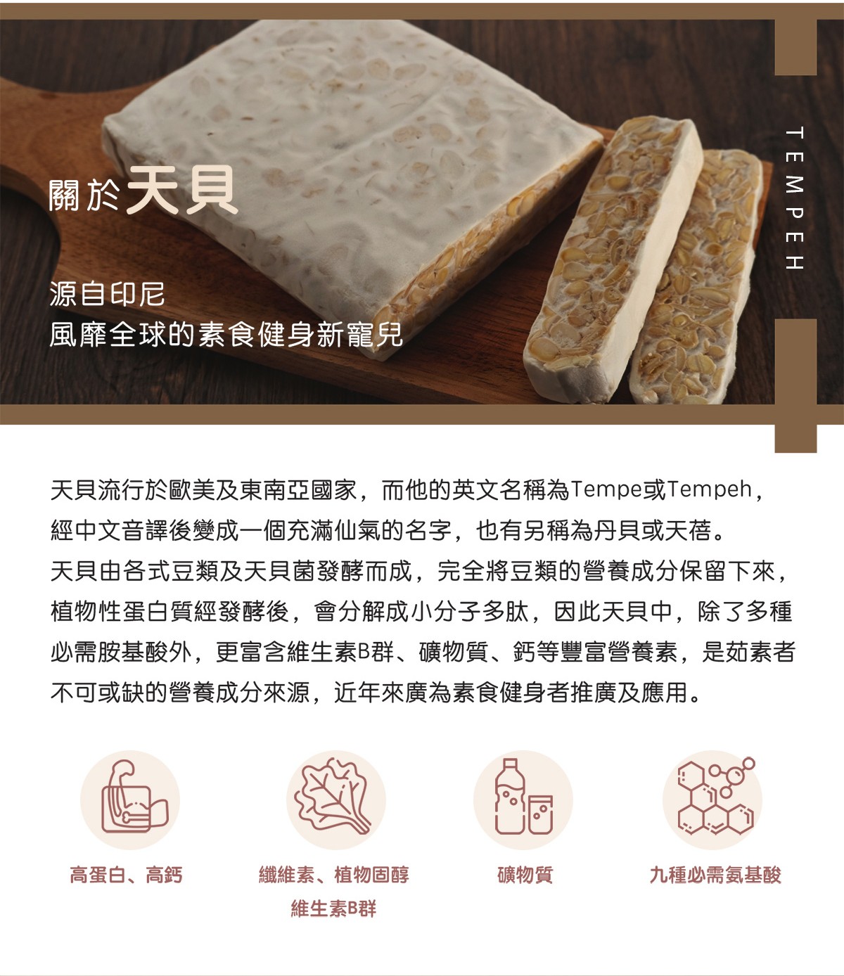 翔鶴佳獨家篩選出的台灣天貝菌種與十幾種豆穀類共同發酵而成的什豆天貝,結合大師手藝精心研製而成,美味料理超百搭,搖身一變成主廚,營養健康都滿意。