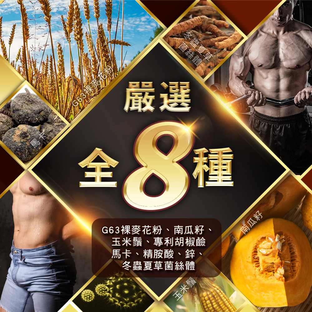 成分:微結晶狀α-纖維素、L-精胺酸、玉米鬚萃取物(玉米鬚萃取物、麥芽糊精)、南瓜籽萃取粉(南瓜籽萃取物、麥芽糊精)、馬卡粉末、黑麥花粉萃取物(微結晶狀α-纖維素、麥芽糊精、黑麥花粉萃取粉、二氧化矽、硬脂酸鈣、磷酸二氫鈣、阿拉伯膠)、冬蟲夏草菌絲體(Hirsutella sinensis)粉末、鋅酵母、硬脂酸鎂、專利胡椒鹼