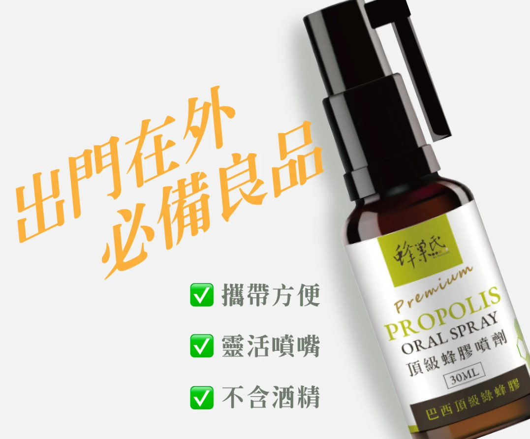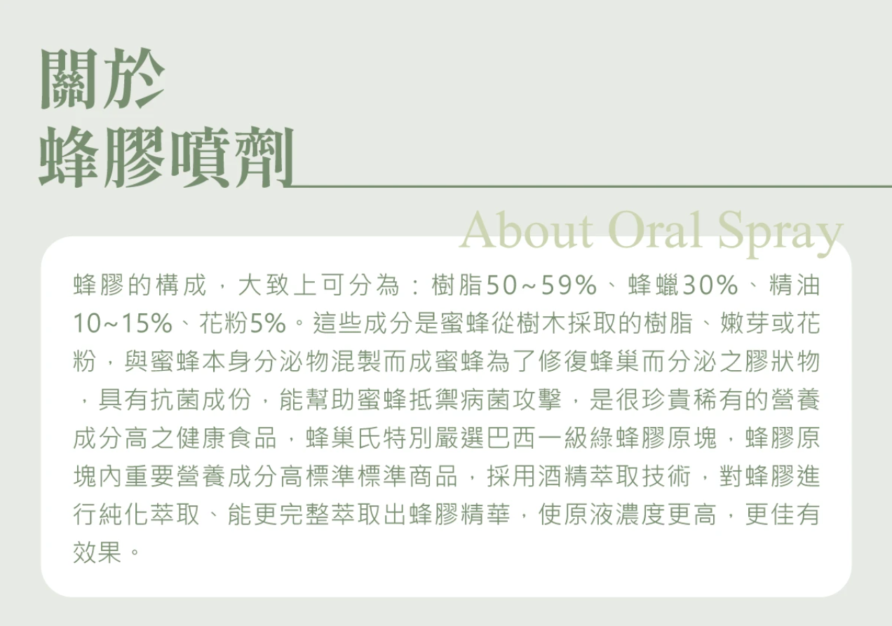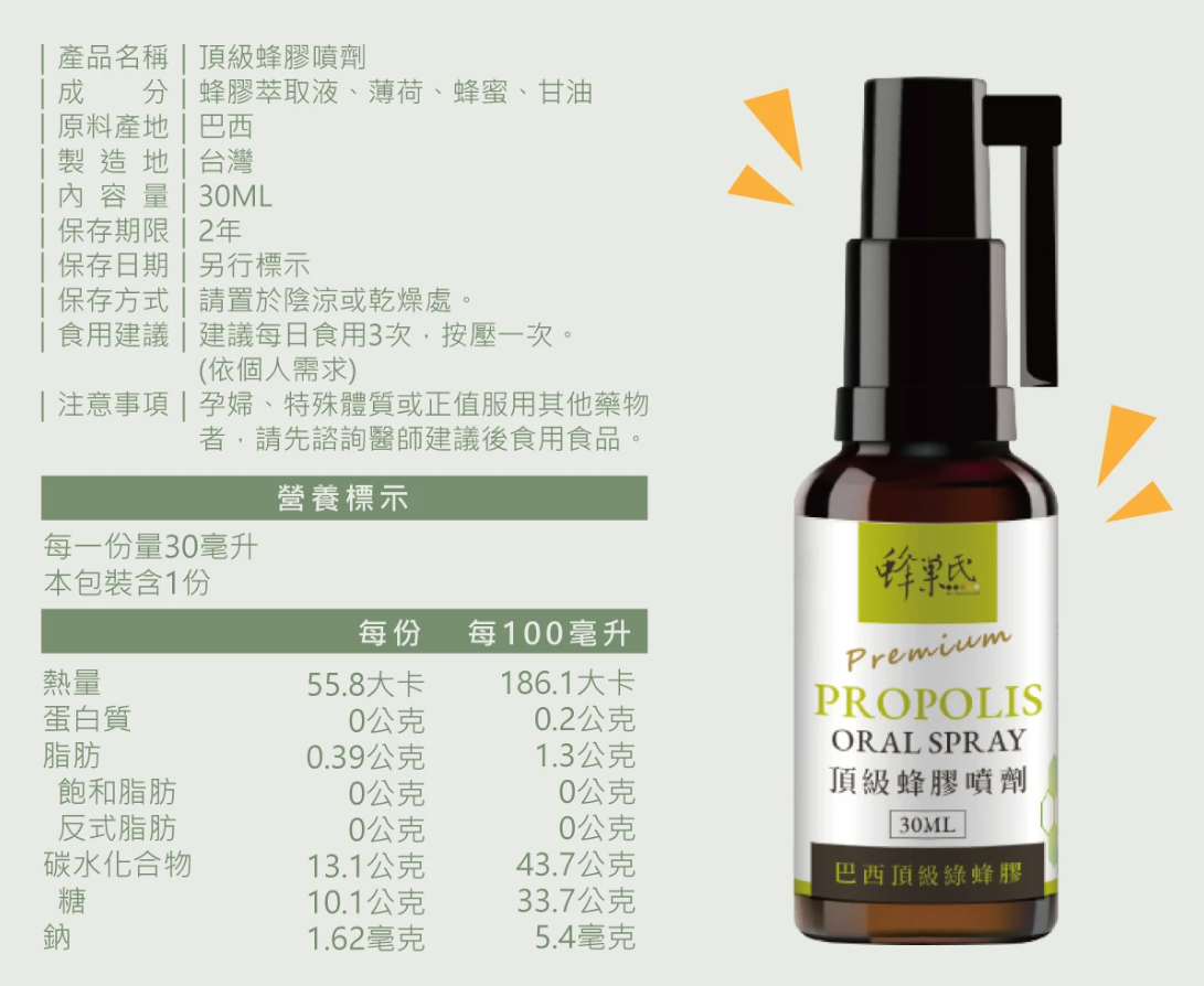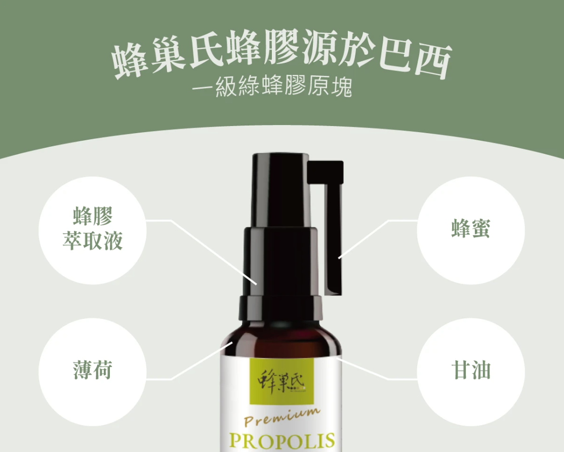 成分:蜂膠萃取液、甘油、純水、蜂蜜、薄荷