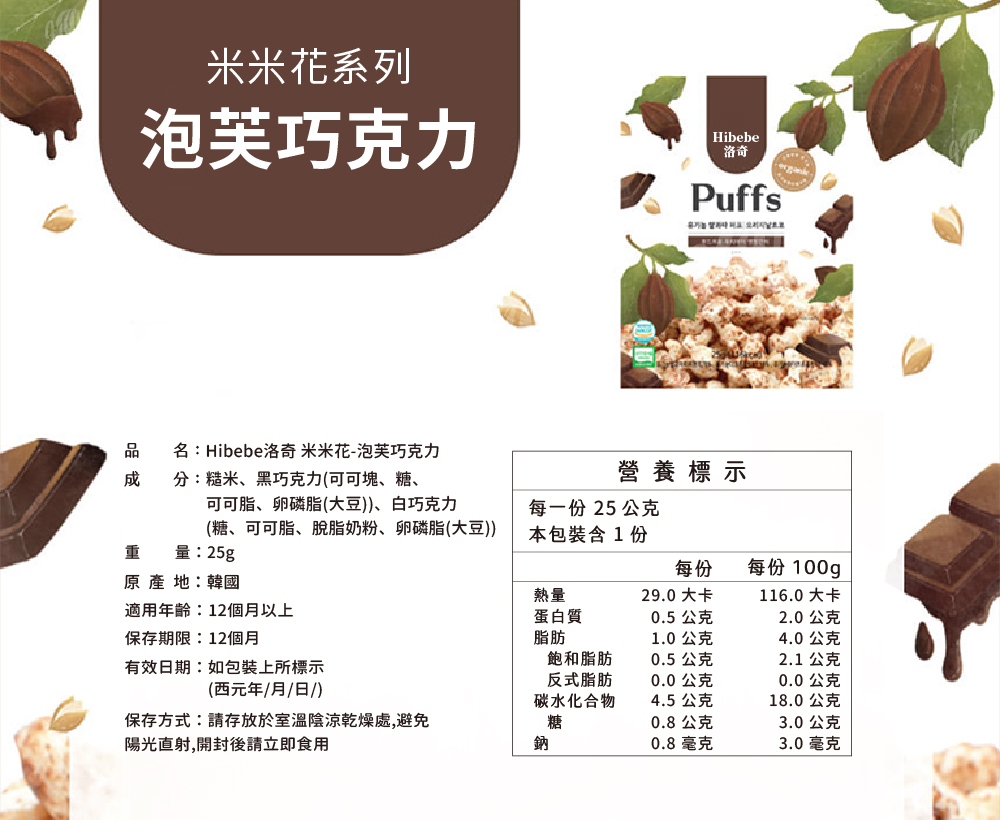 米米花-泡芙巧克力:糙米、黑巧克力(可可塊、糖、可可脂、卵磷脂(大豆))、白巧克力(糖、可可脂、脫脂奶粉、卵磷脂(大豆)