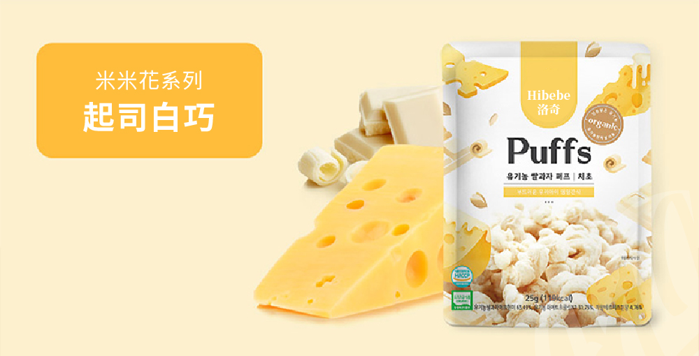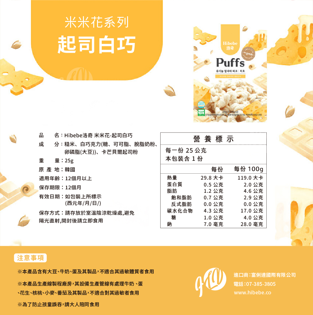 米米花- 韓國起司白巧:糙米、白巧克力(糖、可可脂、脫脂奶粉、卵磷脂(大豆))、卡芒貝爾起司粉