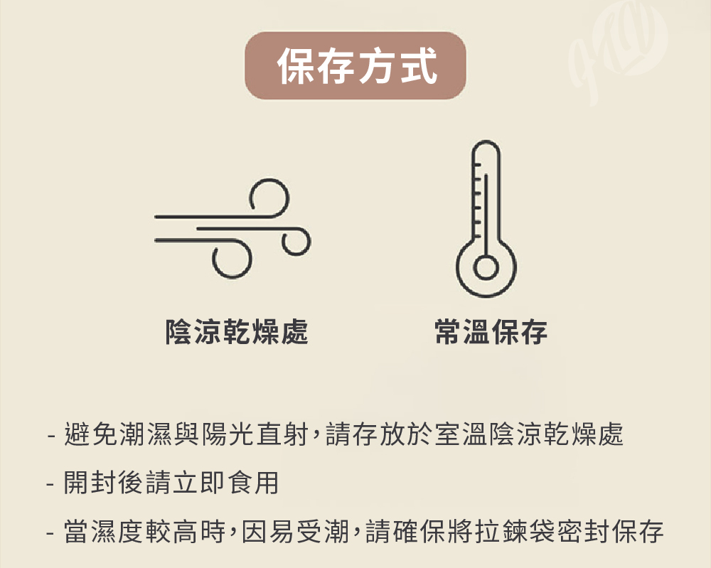 保存方式:置於室溫陰涼乾燥處,避免陽光直射,開封後請立即食用