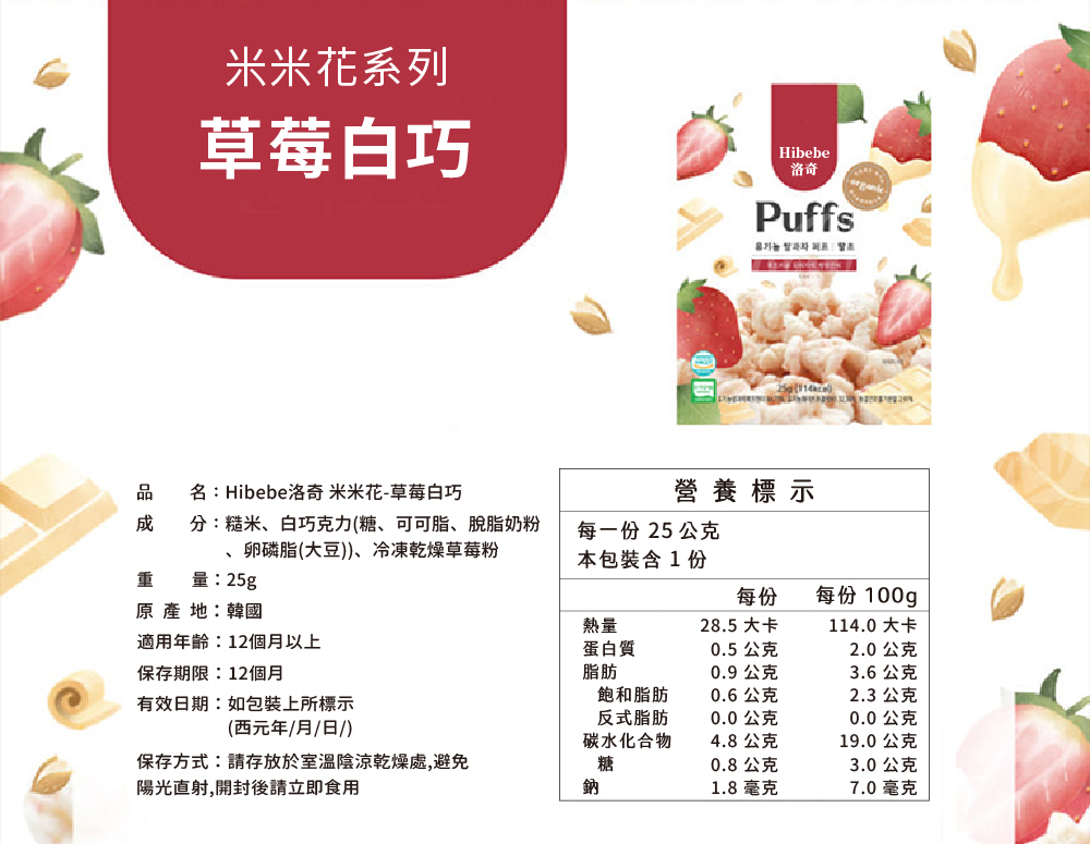 米米花- 韓國草莓白巧:糙米、白巧克力(糖、可可脂、脫脂奶粉、卵磷脂(大豆)、冷凍乾燥草莓粉