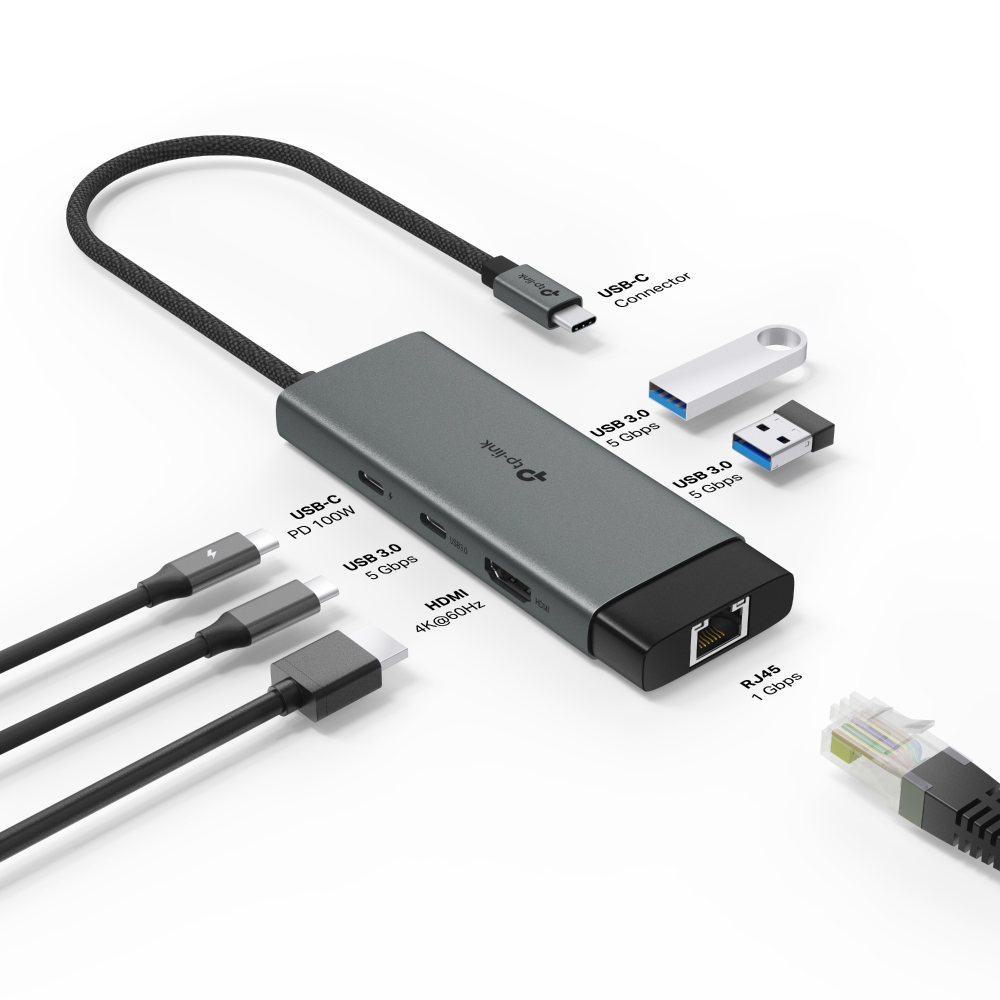 6合1 USB-C 集線器: UH6120C將USB-C單一埠變成6埠,具有4K@60Hz HDMI、1 Gbps乙太網路、100W供電、1 個USB-C埠、2 個USB-A埠