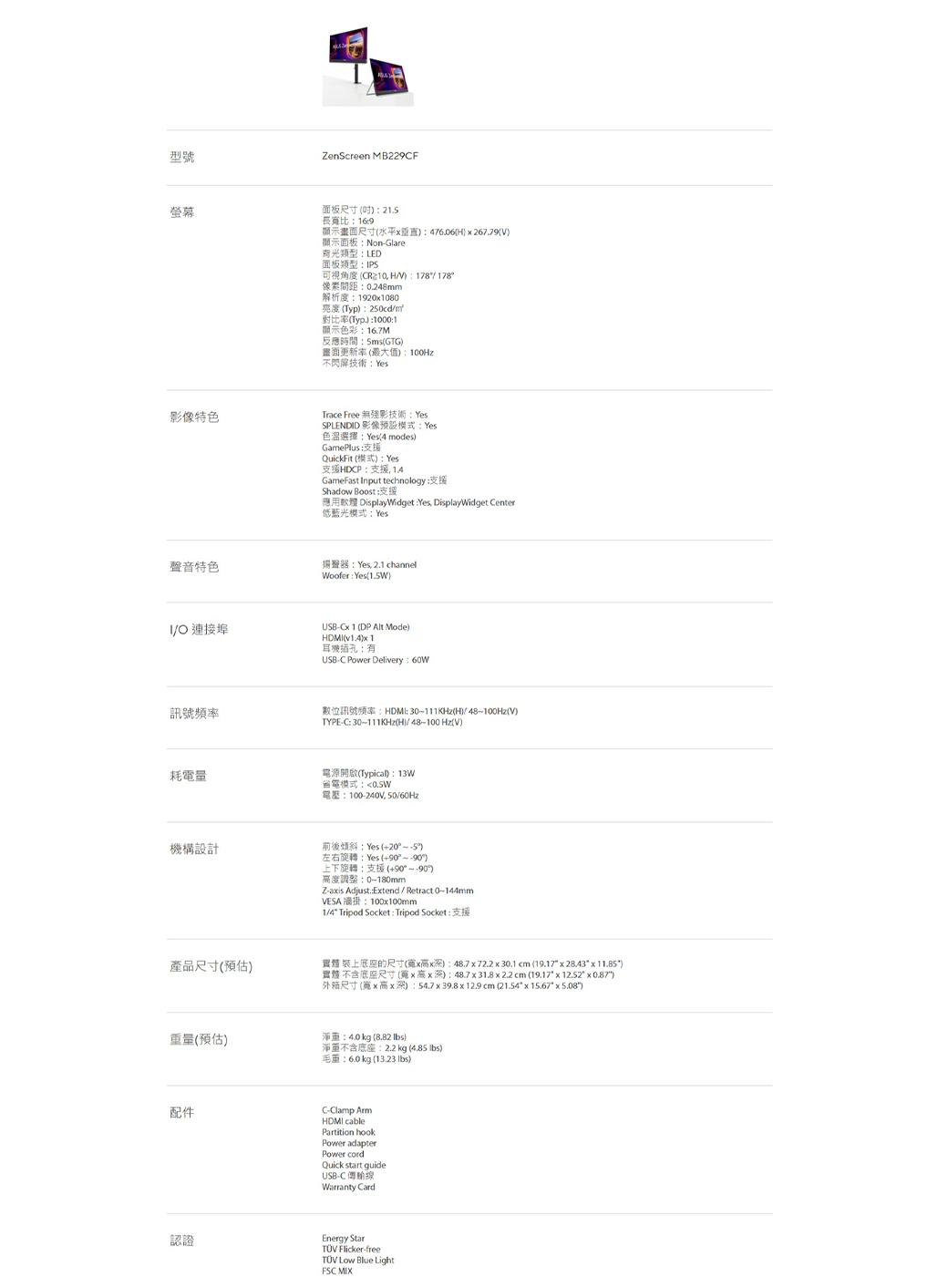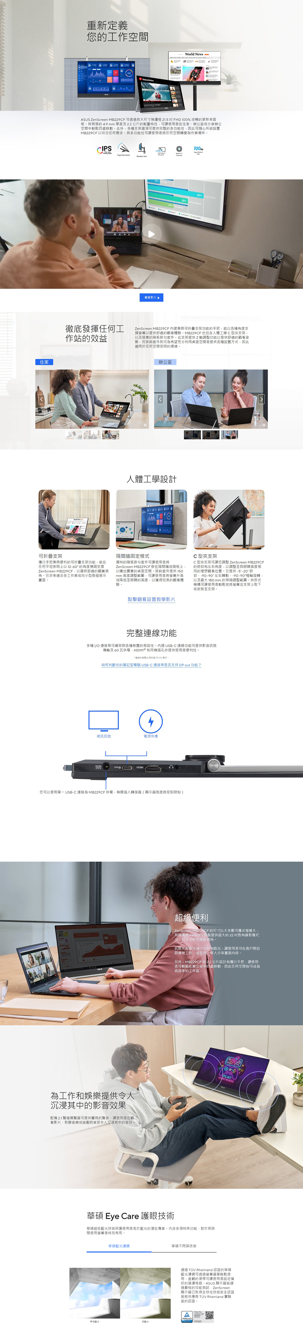 ASUS 華碩 ZenScreen MB229CF 可攜式螢幕(22型/FHD/100Hz/HDMI/IPS/Type