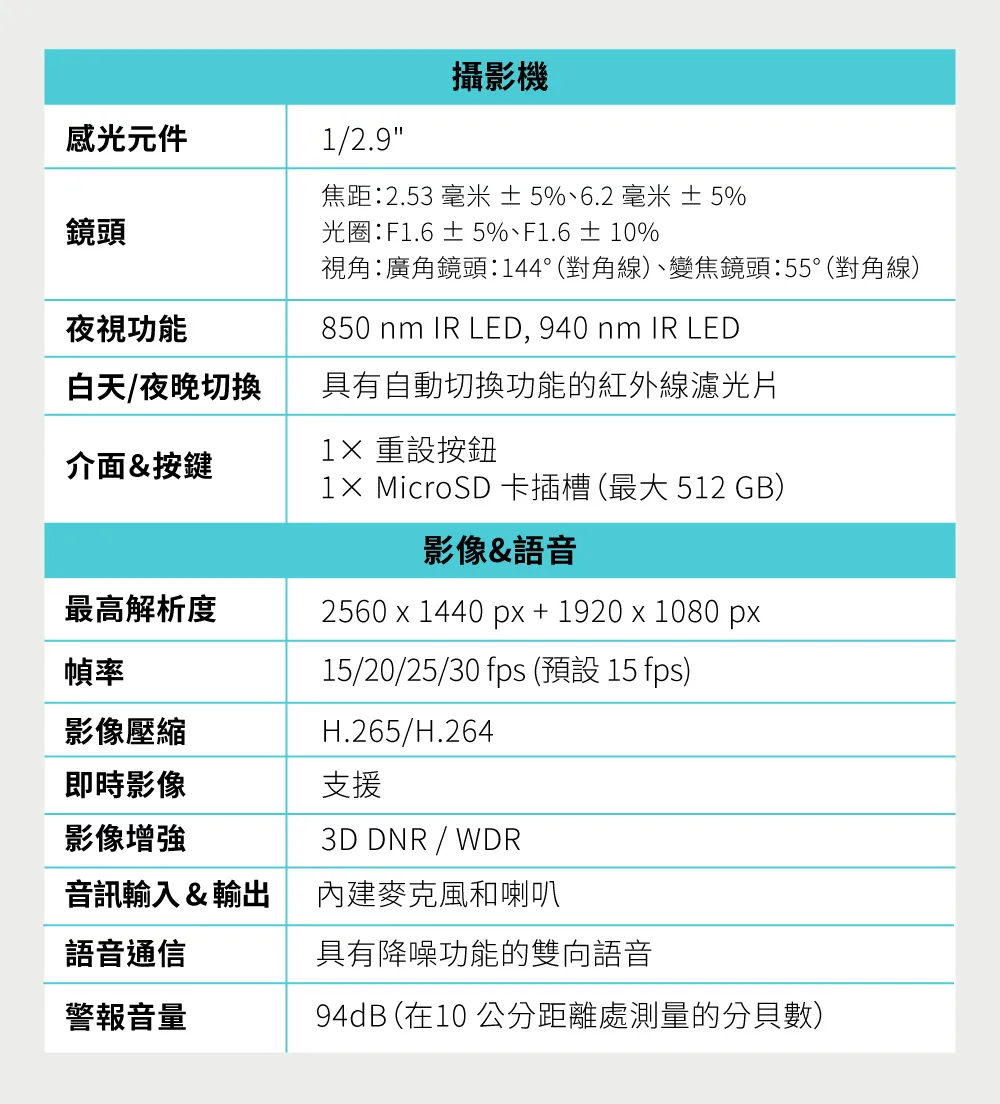 • 雙畫面400萬畫素,1080P長焦鏡頭,高畫質夜視 / AI 偵測及通知(哭聲、臉部遮蔽偵測)