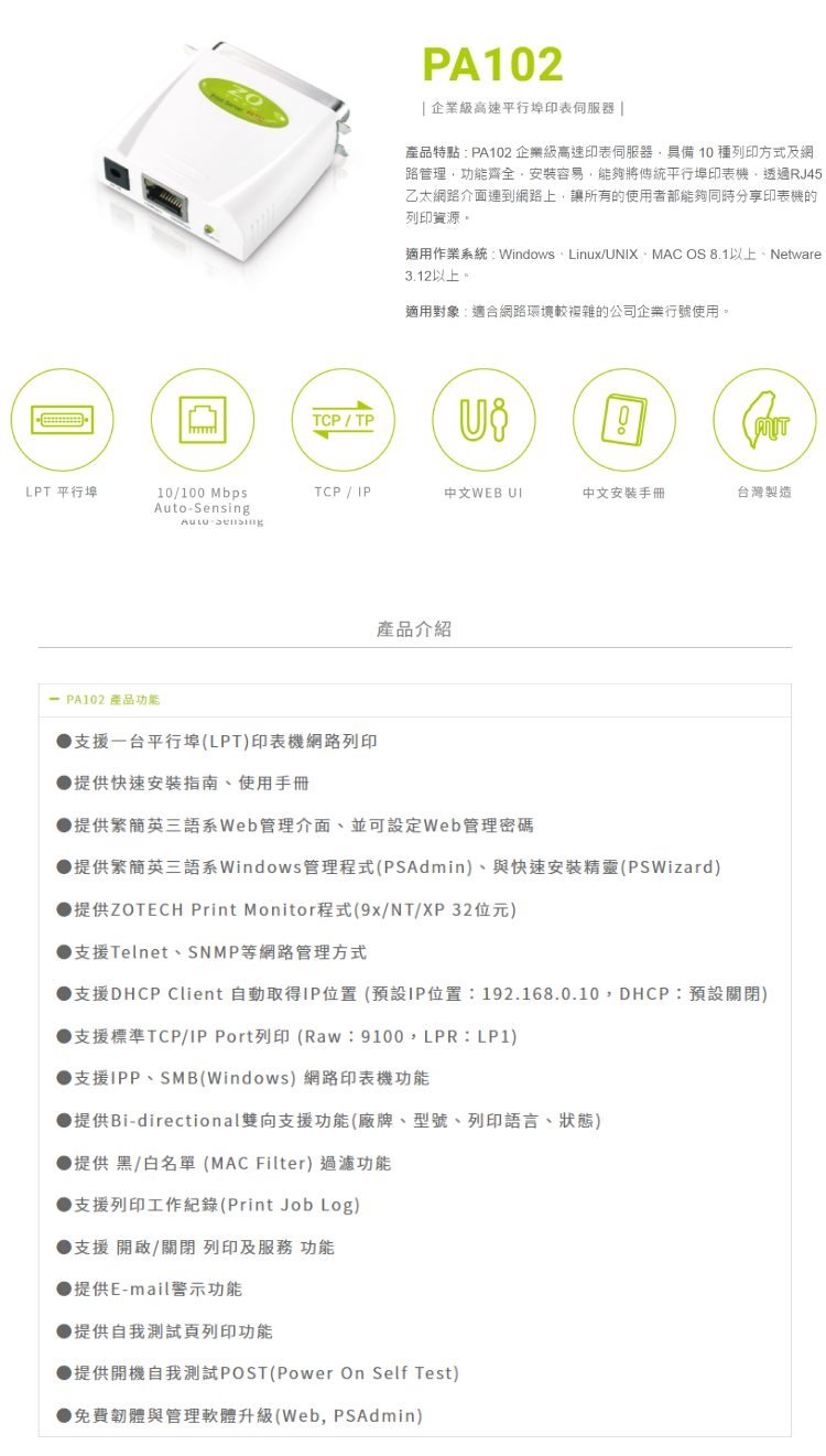 PA102 企業級高速印表伺服器,具備 10 種列印方式及網路管理,功能齊全,安裝容易,能夠將傳統平行埠印表機,透過RJ45乙太網路介面連到網路上,讓所有的使用者都能夠同時分享印表機的列印資源。