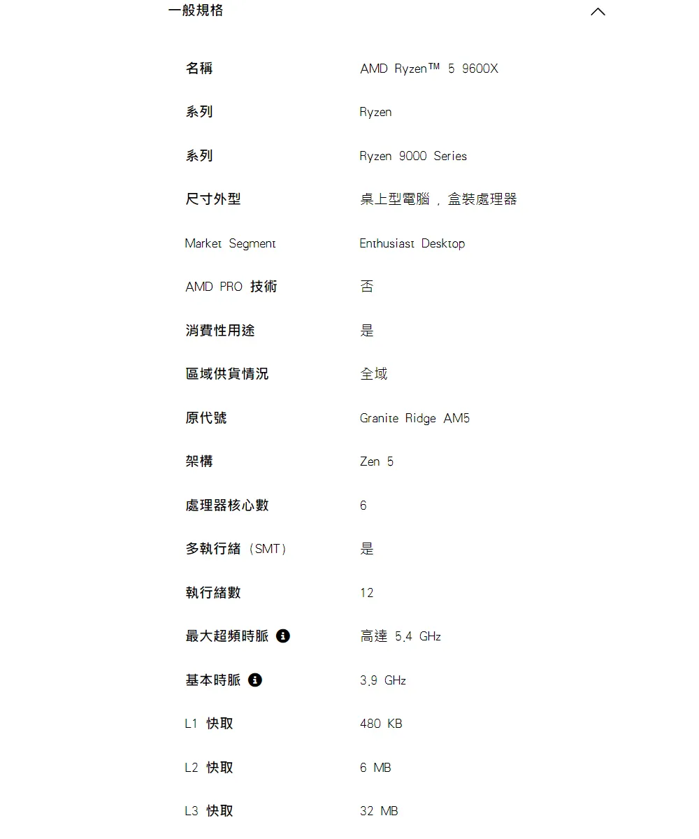 AMD 超微Ryzen 5-9600X 3.9GHz 6核心 中央處理器