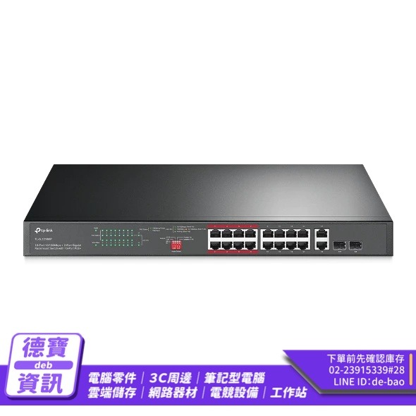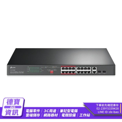 16× PoE+ 10/100Mbps RJ45 連接埠、2× Gigabit RJ45 連接埠和 2× combo Gigabit SFP 插槽