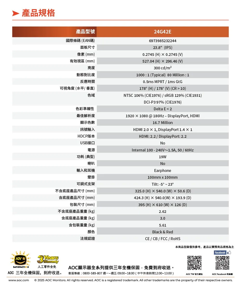 AOC24G42E 電競螢幕(24型/FHD/HDR/180Hz/0.5ms/IPS)/030426