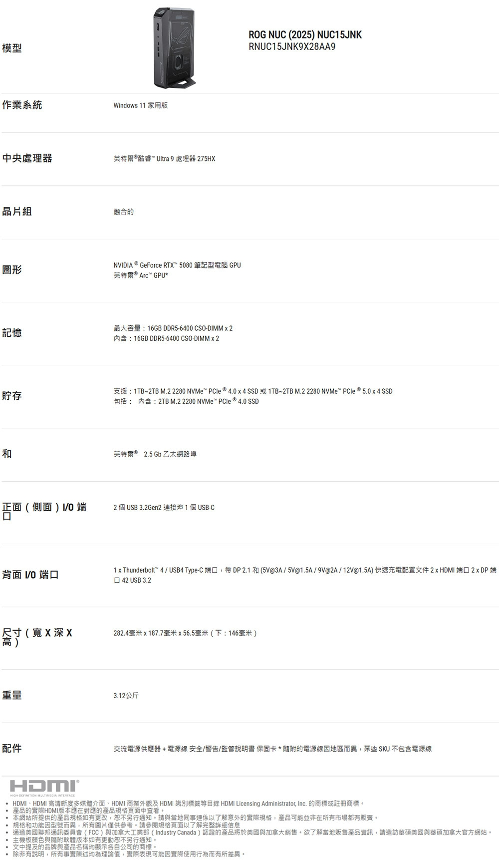 ASUS RNUC15JNK9X389A9 (ROG)U9 275HX/32G/1TB/RTX5070Ti/WIN11