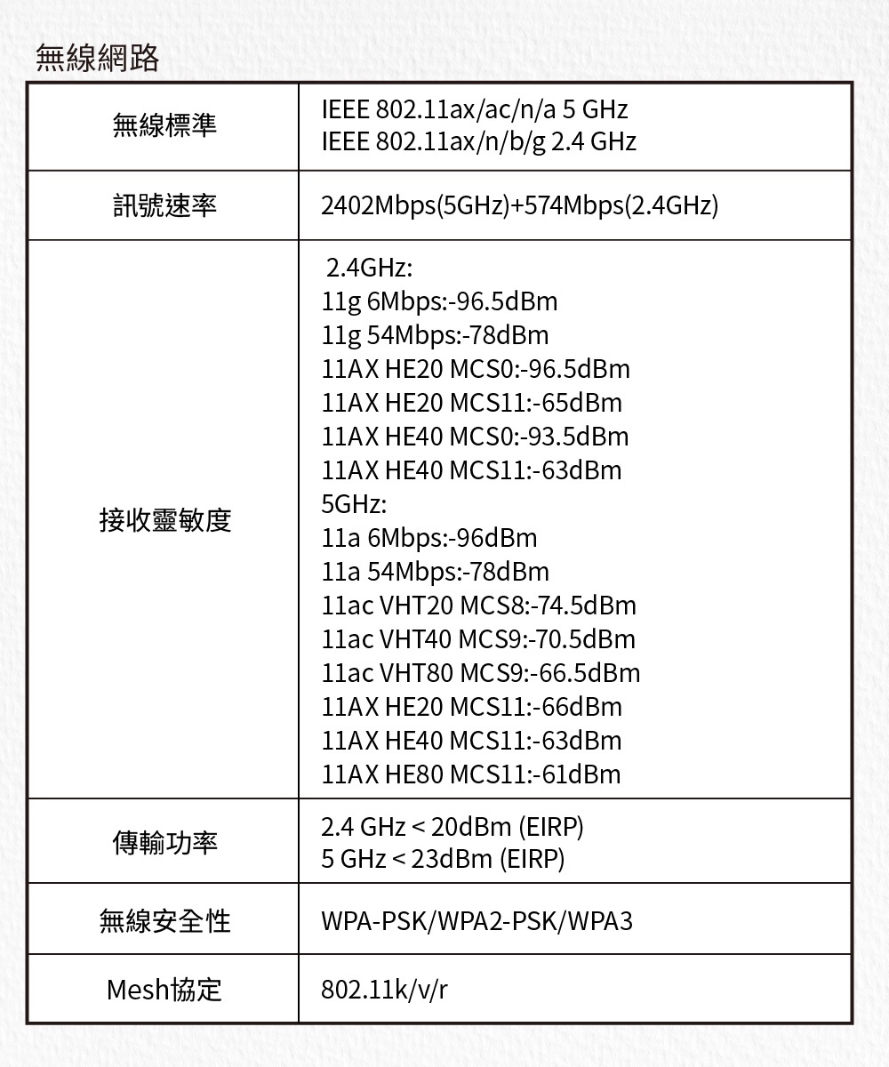 訊號速率 2402 Mbps - 5 GHz, 574 Mbps - 2.4 GHz