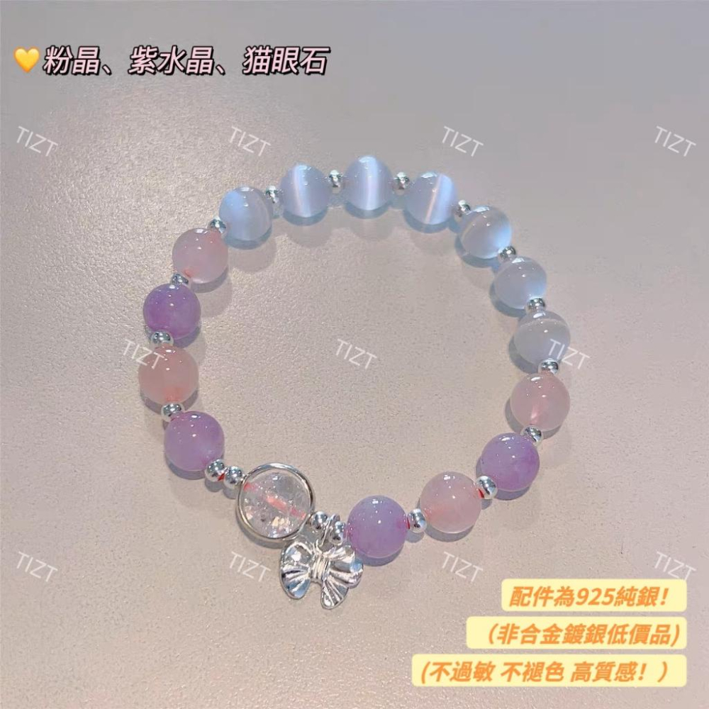 手鍊為彈力線❗️可伸縮❗️ 🔥怕尺寸太小或太大 ⚠️裡面有額外附線 ⚠️ 可自行調整長度❗️ 白貓眼: 貓眼石是好運的象徵 簡稱"尋夢石"、"祝福石" 外型有如宇宙般光環圍繞,象徵愛、希望、祝福及友誼。 粉晶: 配戴粉晶改善人際關係 增強自身氣場的粉紅光 可增異性緣、招桃花 能驅散煩躁心態,讓心情平和快樂。 薰衣草紫水晶: 紫水晶可以增強智力、注意力及記憶力 激發創意,增強自信心,提升考試運 驅散緊張的壓力與煩惱,緩解悲傷和抑鬱的負面情緒。 💖粉晶-旺人緣、增強自身魅力、招桃花 💘紫水晶-增強考試運、助財運、貴人運 💝貓眼石-好運石、象徵光明、美好的祝福 ⭐粉晶的功效⭐ 粉晶粉嫩、討喜的色澤,總帶給人們美好的嚮往。 ◆提升戀愛運 柔化自身的氣質,為自身增添了女性魅力。 ◆增添好人緣 帶有溫暖頻率的粉晶,使我們的舉手投足間更加有魅力與自信。 帶有溫暖頻率的粉晶,使我們敞開胸懷接納他人,散發出友善的磁場,帶來許多好人緣! ◆增加魅力與自信 粉晶帶來的療癒能量,使身心靈得到洗滌與放鬆。 粉紅正面的氣場協助深入內心,補足缺乏的能量。 粉晶有助於柔化氣質,增添個人魅力,讓我們由內而外散發溫和又吸引人的粉紅光芒。 ⭐紫水晶的功效⭐ ◆ 吸收負能量 紫水晶能量之一就是有助於吸收負能量、阻擋消極情緒的磁場,幫助想法變得積極。  ◆ 舒緩情緒、靜心安定 紫水晶可以幫助人靜心安定、緩和浮躁的情緒和脾氣。  ◆ 開發潛能、提升能力 紫水晶飾品可以幫助我們集中注意力,像是紫水晶手鍊功效之一就能協助增強記憶力,減少忘東忘西的困擾,並且紫水晶對應頂輪,所以可以幫助開發靈性智慧以及潛力,以更宏觀、冷靜的角度去思考事情。  ◆ 職場人緣大加分 紫水晶是社交之石,與粉晶招來好人緣或好桃花不同,紫水晶招財、招貴人屬於增進正財運,可以讓人氣質更內斂,幫助你吸引頻率相似的貴人,更適合職場、工作上的發揮,如果是主管配戴紫水晶,還可以消除嚴肅隔閡感,加強包容心,增加團隊的信任度,強化領導統馭信賴感,幫助你的事業大加分!  ◆ 保護愛情、增進感情 紫水晶有著「愛的守護石」的美名,可以幫助雙方建立對等關係,也能幫助自己認清感情的渴望與需求,而其中薰衣草紫水晶功效更是被認為擁有「保護愛情」、「增進感情」的力量。