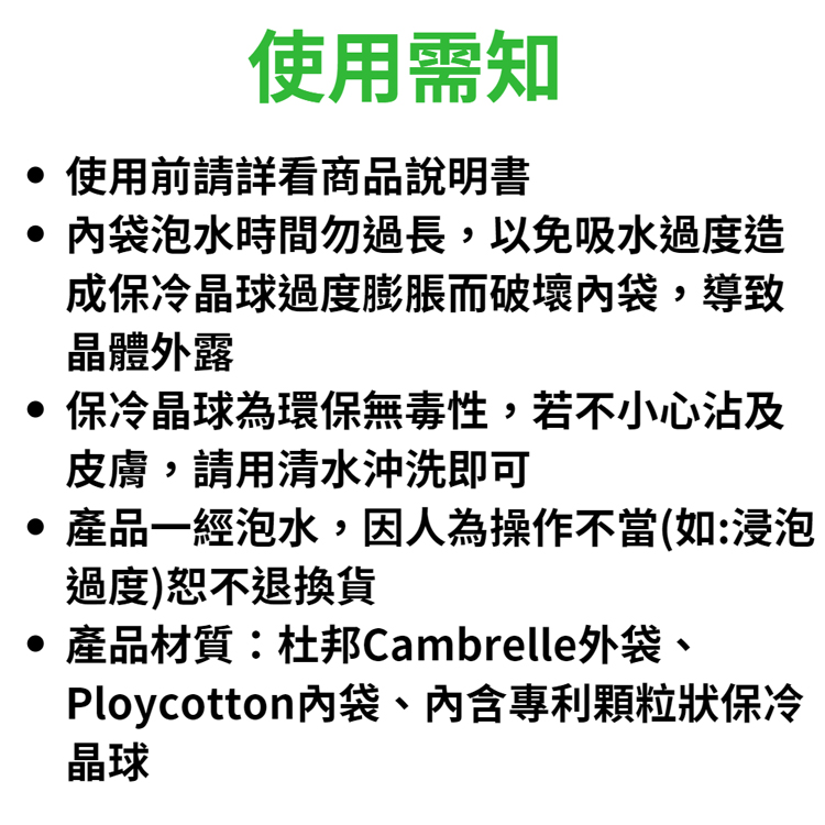 不用冰箱, 不用插電, 泡水10分鐘, 酷涼一星期