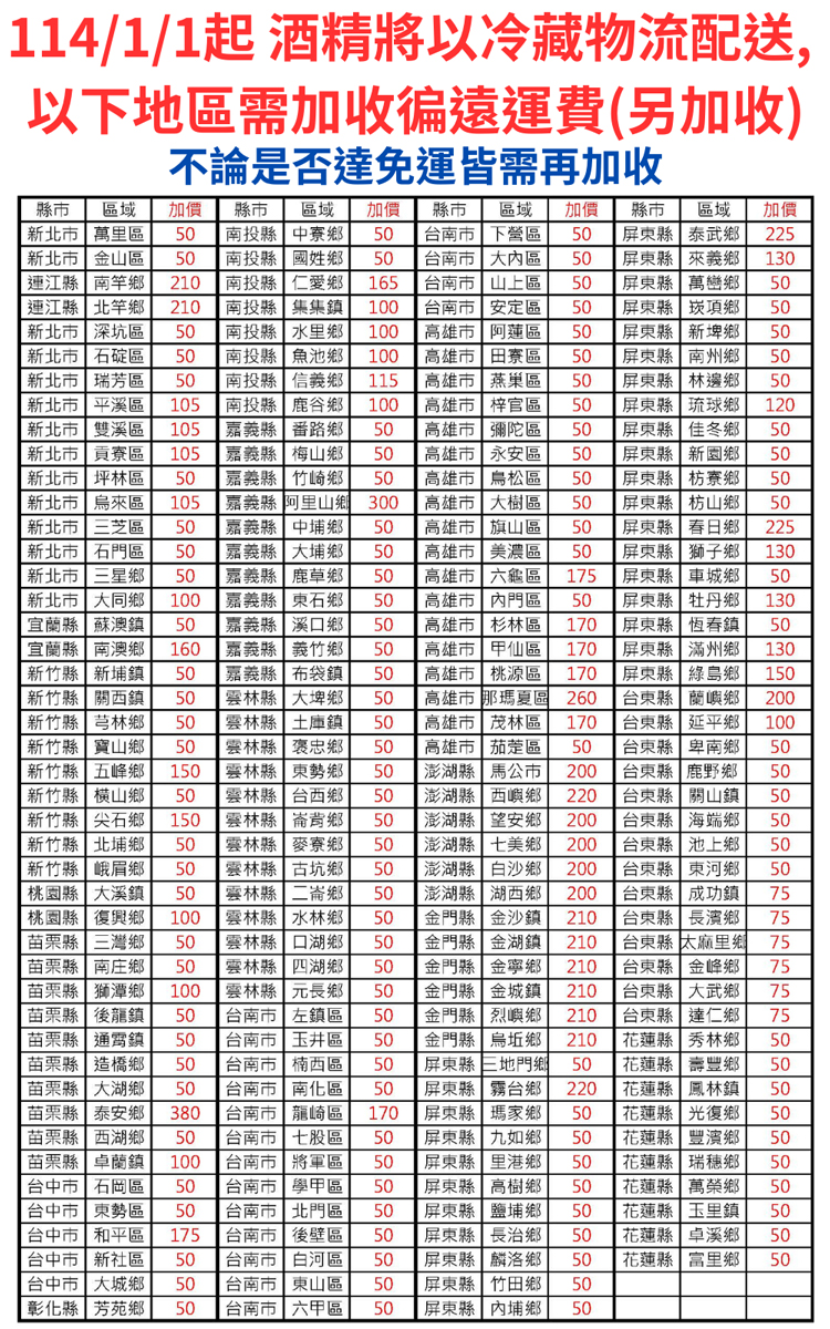 114/01/01 起, 酒精採醫藥冷藏車配送, 部份地區將額外收取加收運費!(如下表)