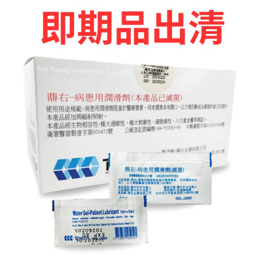 https://s-cf-tw.shopeesz.com/file/tw-11134208-7r98o-lkyn6zhmvqq9bb 使用用途: 病患用潤滑劑是基於醫療需要, 用來潤滑身體開口, 以方便診斷或治療器材進入. 本產品經加瑪幅射照射滅菌. 成份: 純水, 凝膠生成劑, 鹼化劑 包裝: 3ML/100包/盒 PH值: 6.2~7.4 保存條件: 保存室溫陰暗處, 避免陽光直接照射 注意事項: 本產品為醫療製品, 使用依相關辧法處理 消費者使用前應詳閱醫療器材說明書 醫療器材許可證所載核准字號:衛署醫器製壹字第003472號 醫療器材許可證所載品名:"鼎右"病患用潤滑劑(滅菌) 醫療器材許可證所載藥商名稱:鼎右企業有限公司 製造廠名稱及地址:鼎右企業有限公司 台中市太平區富宜路146巷3弄32號 藥商/醫療器材商許可執照所載名稱:富揚儀器股份有限公司 藥商/醫療器材商地址: 新北市五股區五權五路22號3樓 藥商許可執照字號:新北府重衛藥販 字 6231027568 號 諮詢專線電話: 02-2299-2177 服務時間: 週一至週五 09:00~17:00(假日除外) 統一編號: 70507369 產品製造日期: 詳見產品外包裝 有效期間或保存期限: 詳見產品外包裝