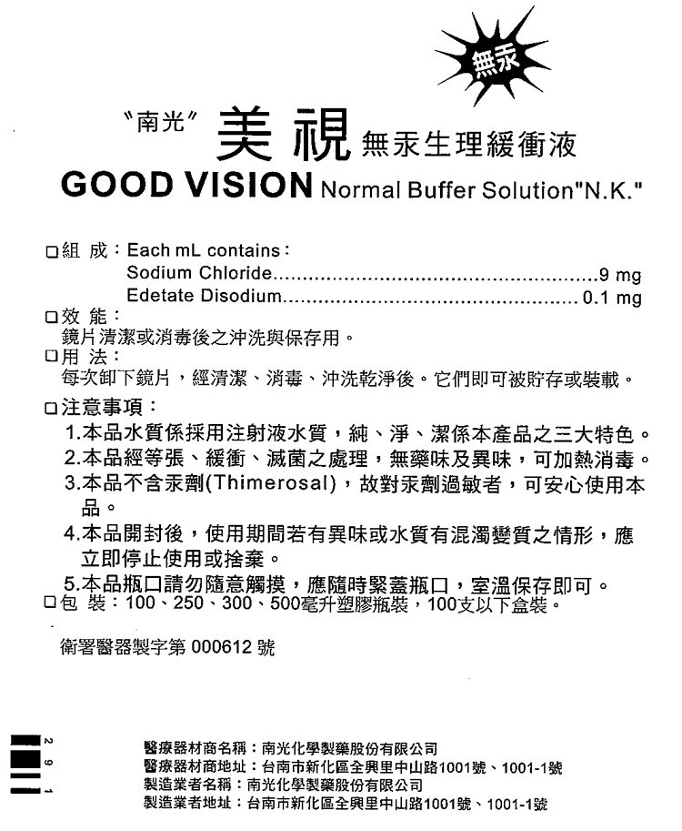 醫療器材許可證所載品名:"南光"美視無汞生理緩衝液