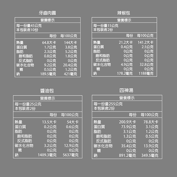 過敏原資訊:四神湯:本產品含有麩質穀物製品、奶類、蛋類、大豆及其製品,不適合其過敏體質者食用。