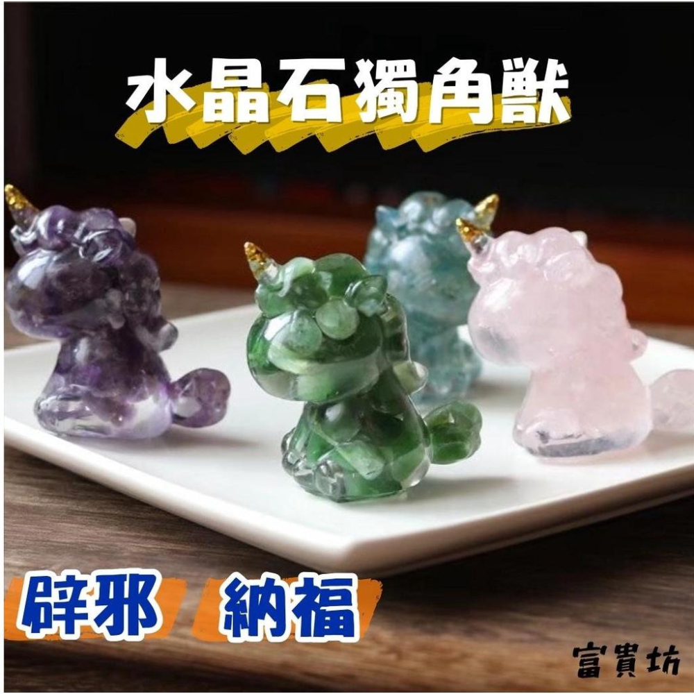 『富貴坊』【開光】水晶石風水獨角獸,辟邪獨角獸,守護神獸,水晶碎石,化煞擋災,趨吉避凶,開運轉運,招財迎福H01 名稱:水晶石風水獨角獸 【意義】 1、在古代神話中,傳說是一種頭頂正中長有一隻單角的動物,並且獨角獸有解毒功能。 2、風水中的獨角獸,一角的稱為天祿辟邪。放在家裡辟邪。可以把不好的運氣和風水擋在門外。 3、象徵著高貴和純潔。現在流行的西方神話中,獨角獸是一個形如白馬,額頭長著螺旋角,代表高貴,高傲和純潔。 4、東陵玉:平緩心緒。綠色象徵著生命和希望,是很多人喜歡的顏色。佩戴綠色東陵玉吊墜能夠撫平人們心中煩躁的情緒,變得快樂豁達,增進自我判斷力,有益身心健康,帶來幸運。還能帶來財富和幸福,是商人、賭徒的幸運石。 5、紫水晶:又叫靈性水晶,代表著愛的守護石,能賦予情侶、夫妻間深厚之愛、貞節、誠實及勇氣。紫水晶,象徵誠實、心底善良、廣結人緣、平安吉祥和心平氣和。 6、虎眼石:反射出如貓眼般的璀璨光芒,天然水晶石中虎眼石能激發出勇氣,帶來信心,堅定信念,使人勇敢。能軟化頑固、固執,使之合理化,而能跟的上時代潮流,不致被淘汰,帶來積極進取的人生觀與做事精神。 7、彩螢石:螢石有著較強的能量,它能除去人體積累的負能量,抵抗和防止外來負能量的入侵。戴著螢石辦公、讀書能夠屏除雜亂思緒也不易受到外在意見的干擾,能有效得增進學習和工作效率。 8、白松石:具有鎮宅、辟邪擋煞的的功效。在屋內擺放白松石擺件可起到鎮守門宅的功用。還可保護財富、聚財旺財,興旺門戶。另外,白松石也可作為護身符。 9、粉水晶:散發著溫和而吸引人的粉紅色光芒,可協助改善人際關係,增進人緣、生意緣,是開門做生意的最佳利器。 10、黑曜石:能量強勁剛烈,可避邪、鎮宅,可消除病氣、濁氣、霉氣,帶給人健康、快樂、正常的人生,有「黑金剛武士」之美譽。 【擺放】 放在客廳、玄關、辦公室近門之處即可,或者置於辦公桌、書房桌上朝門口。 【尺寸】 約高7cm。 【材質】 水晶石。 【款式】 東陵玉、紫水晶、虎眼石、彩螢石、白松石、粉水晶、黑曜石。