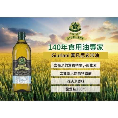 喬凡尼玄米油1公升 (玻璃瓶) 2瓶禮盒組$600 6瓶抗通膨$1800(無禮盒) 義大利Giurlani :超過130年的食用油專家,Since 1880。是由Giurlani家族所創立,並且遵循Giurlani先生親自訂定的製作程序及品質標準。及至今日,每一瓶義大利Giurlani食用油保有130多年來一貫堅持的高品質與風味。 Giurlani 喬凡尼玄米油,義大利原裝原罐進口,100%純度。 風味:淡淡的甜、米香味。 用途:發煙點高(約250℃),煎、炸等中高溫烹調方式均適合。 品質優:烹調時不易產生油煙。 內容: 義大利Giurlani 喬凡尼玄米油1L 6罐。 內容物:100%玄米油 顏色 :金黃色 風味 :淡淡米香味 發煙點:約250℃ 主要養分:γ-穀維素、植物固醇 使用建議:煎、煮、炒、炸皆適宜 保存期限:自製造日起2年 儲存方式:請勿倒放,並儲存於常溫陰涼處 ⚠️超商取貨只限2瓶!!!