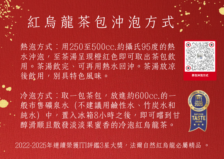 冷泡方式:取一包茶包,放進約600cc.的一般市售礦泉水(不建議用鹼性水、竹炭水和純水)中,置入冰箱8小時之後,即可嚐到甘醇滑順且散發淡淡果蜜香的冷泡紅烏龍茶。