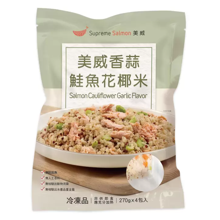 | 成分 | 白花椰菜、大麥仁、鮭魚、毛豆仁、洋蔥、紅蘿蔔、蒜頭、橄欖油、紅藜麥、調味料(麥芽糊精、食鹽、蔗糖、酵母抽出物、黃豆水解蛋白、香菇抽出物、高麗菜抽出物)、食鹽 |