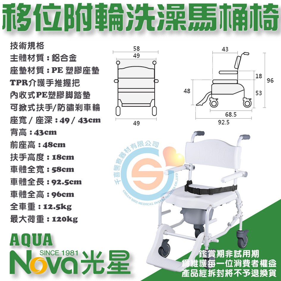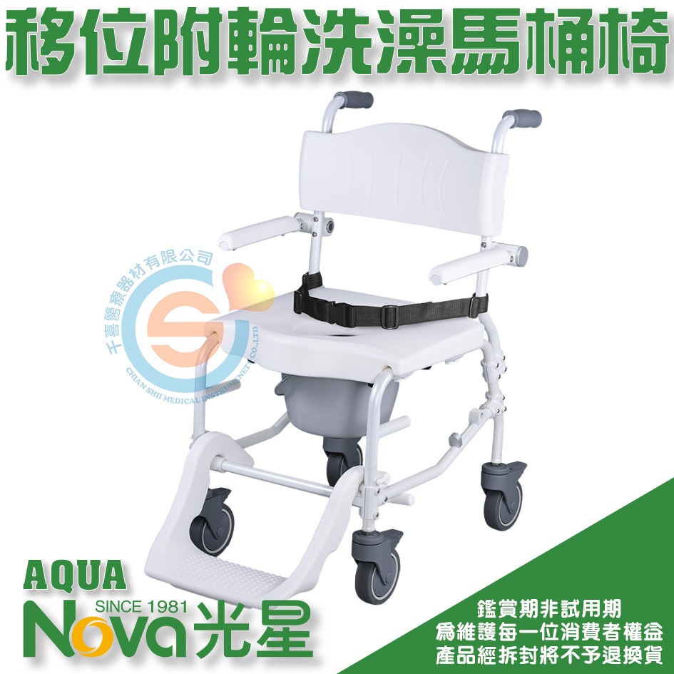 NOVA 光星 AQUA 介護移位型附輪洗澡馬桶椅 有輪便器椅 有輪洗澡椅 活動式扶手活動式腳踏 千喜醫療 台灣製造