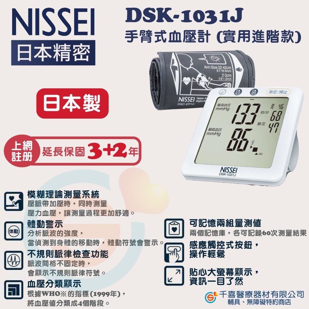 【來電有優惠】NISSEI 日本精密 DSK-1031J 手臂式血壓計 (實用進階款) (日本製) 含變壓器