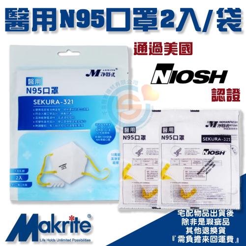 Makrite 凈舒式 醫用N95口罩 SEKURA-321 (2入袋) 獨立包裝 通過美國NIOSH認證 可調整耳掛式