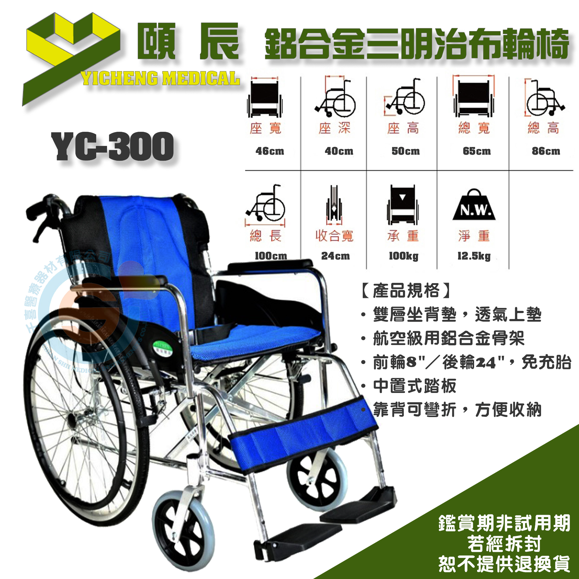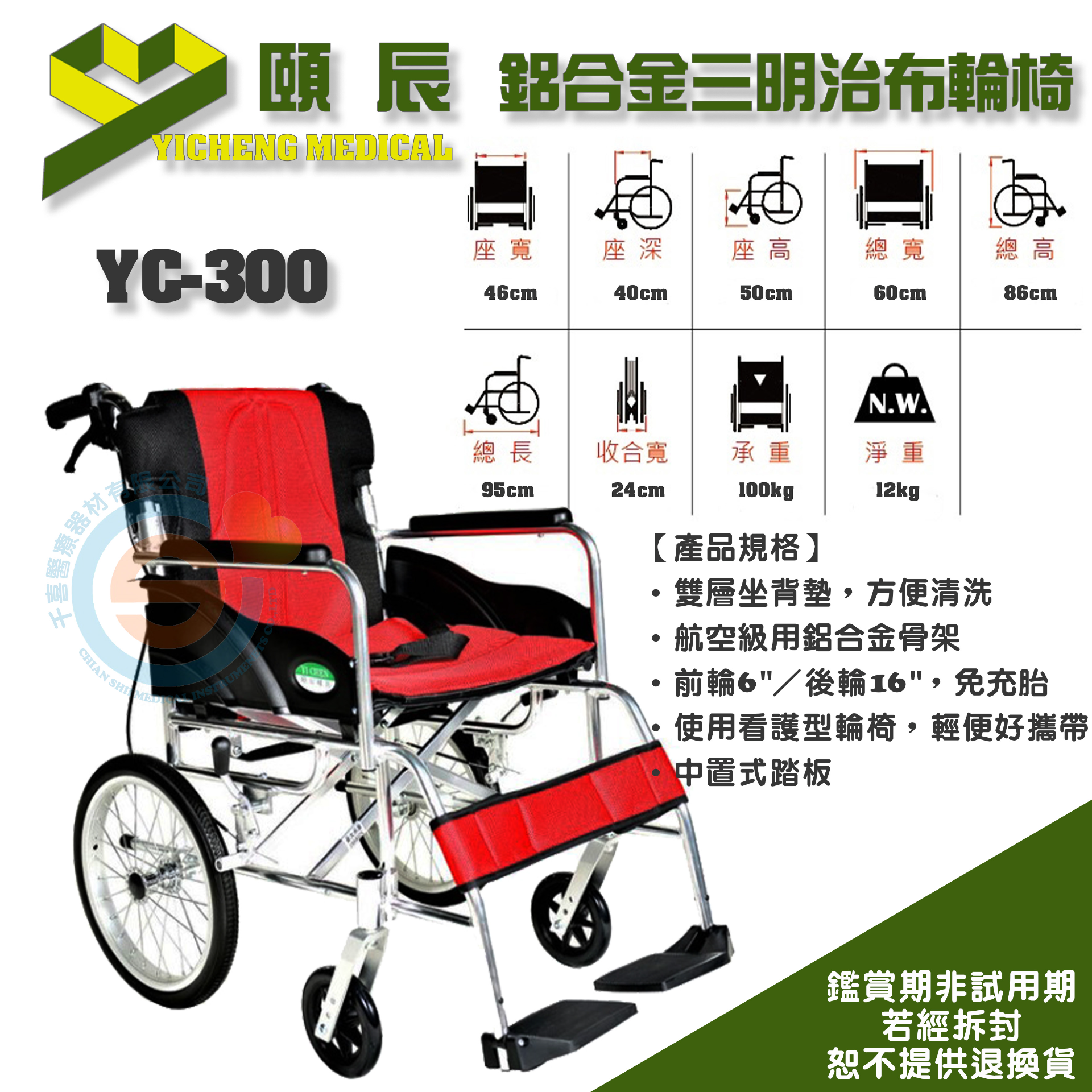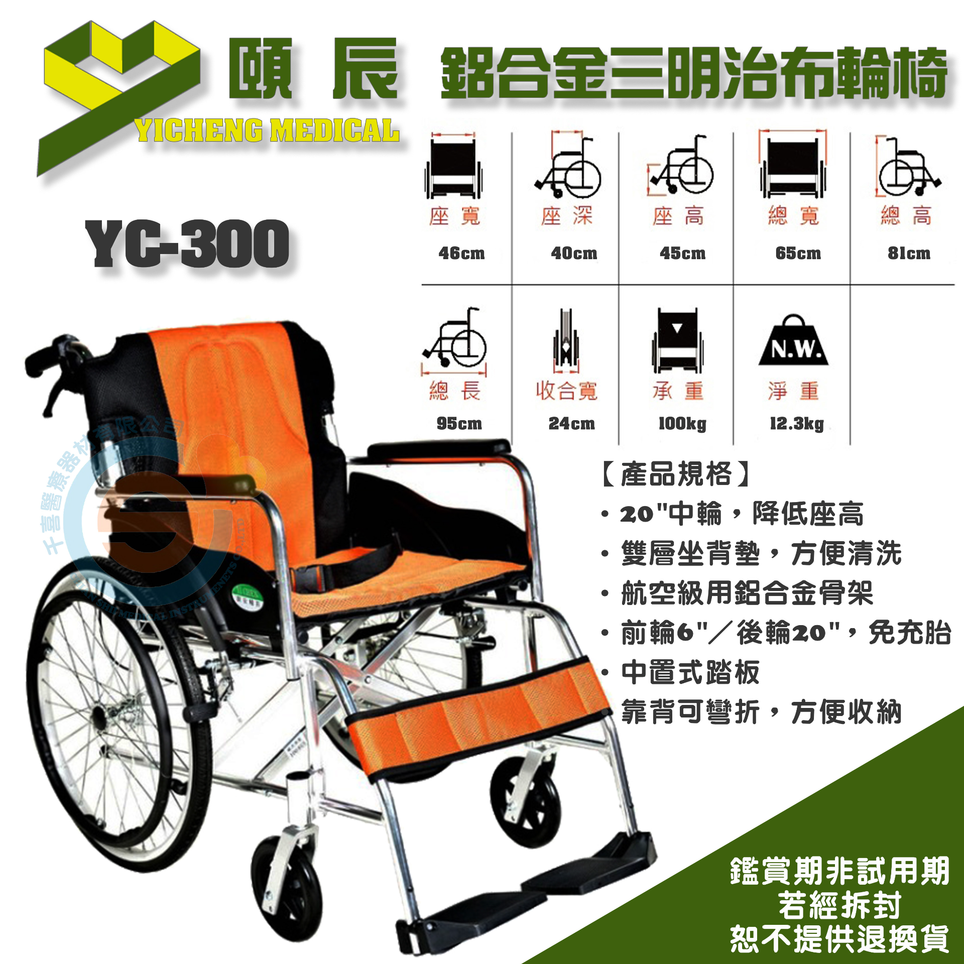 頤辰 YC-300 鋁合金輕量化輪椅 量產型輪椅 機械式輪椅 輕量型輪椅 外出型輪椅 輕便小輪輪椅 折疊輪椅 輕量輪椅