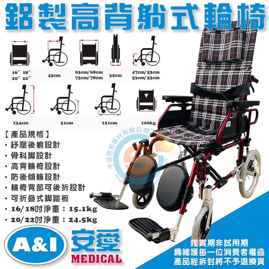 A&I 安愛 康復 1811P 1611P 2011P 鋁合金高背躺式輪椅 全躺平輪椅 抬腳輪椅 加寬輪椅 醫療輪椅