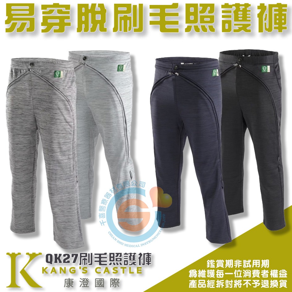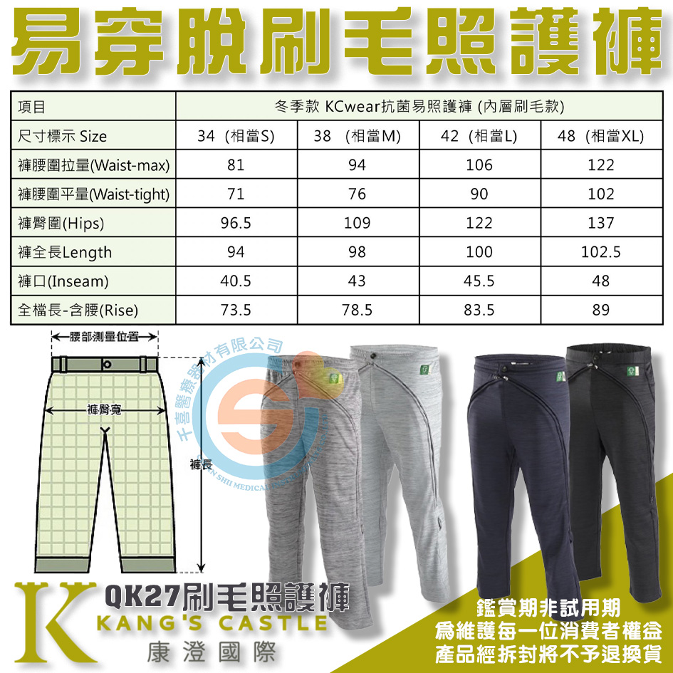 Kcwear 康澄 KC QK27易穿脫刷毛照護褲 限量款 冬季易穿照護褲(內層刷毛款) 前腹部雙弧型三頭拉鍊專利設計