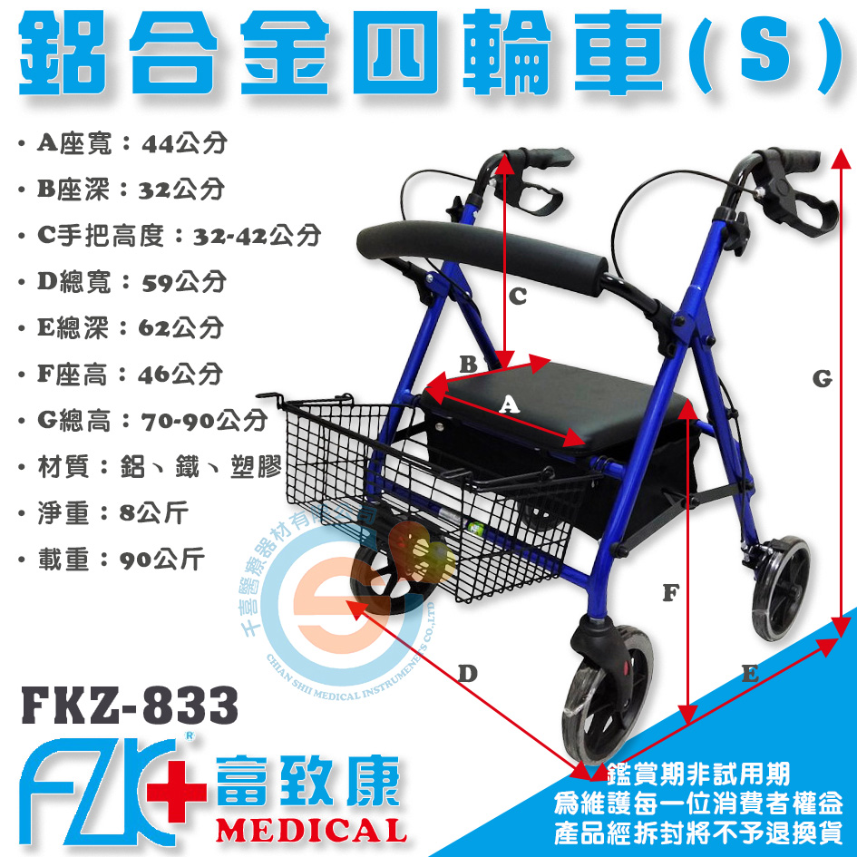 FZK 富士康 FZK-833 四輪車 助步車 健步車 菜籃車 鋁合金 助行椅 行動輔具 復健車 購物車 散步車