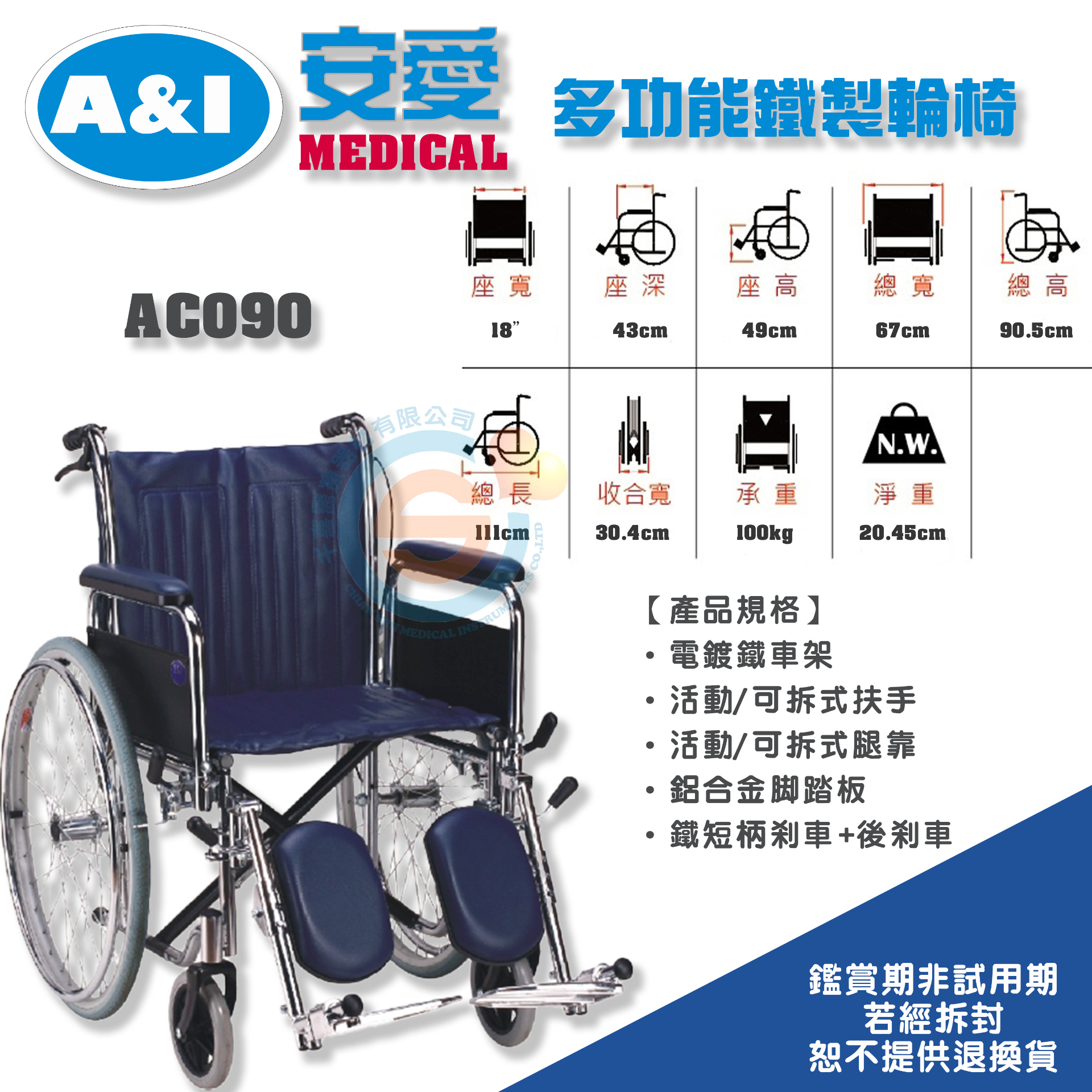 安愛 A&I 康復 AC090 第五代電鍍鐵輪椅 骨科輪椅 可拆式升降腿 可拆式扶手 鋁合金踏板 復健輪椅 銀髮輔具