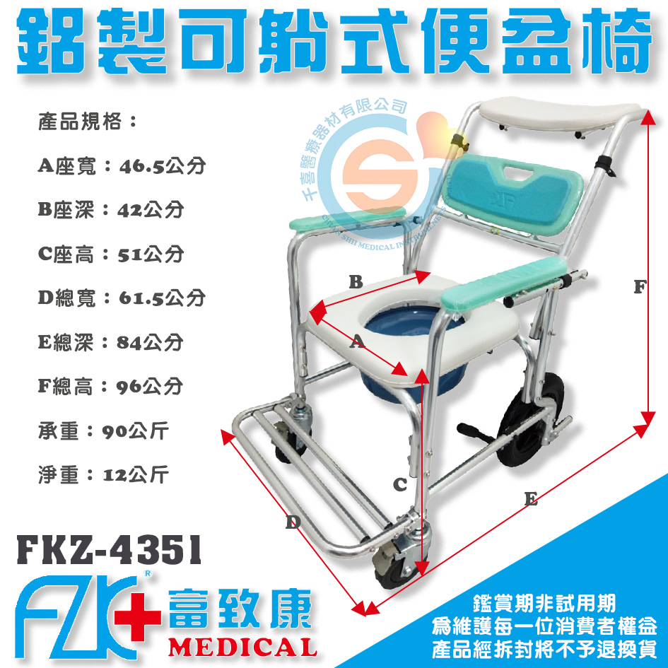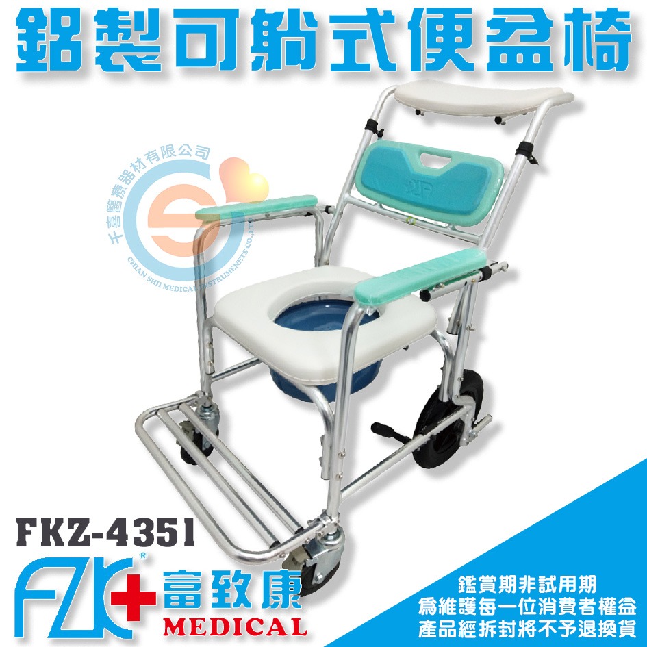 FZK 富致康 FZK4351半躺鋁合金有輪固定便器椅 鋁合金可躺洗澡椅 可躺洗澡便盆椅 附頭靠洗澡椅 高背洗澡椅富士康