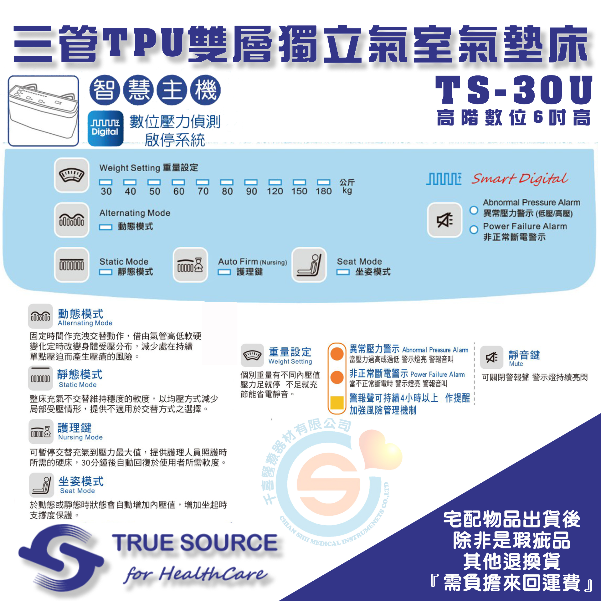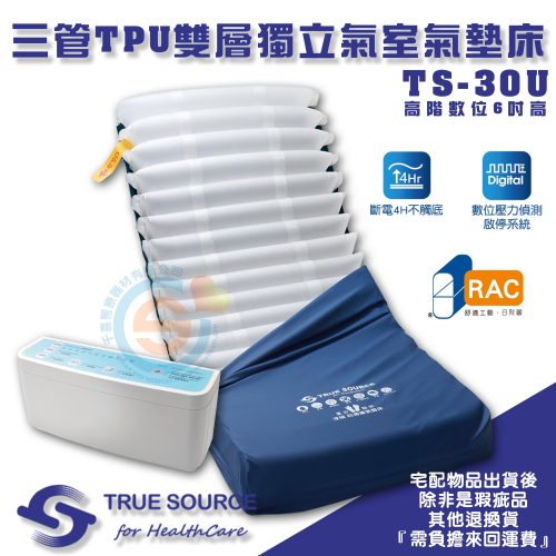 TRUE SOURCE 淳碩 TS-30U 高階數位進階型 6吋三管純TPU雙層獨立氣室氣墊床 多功能減壓氣墊床 減壓床