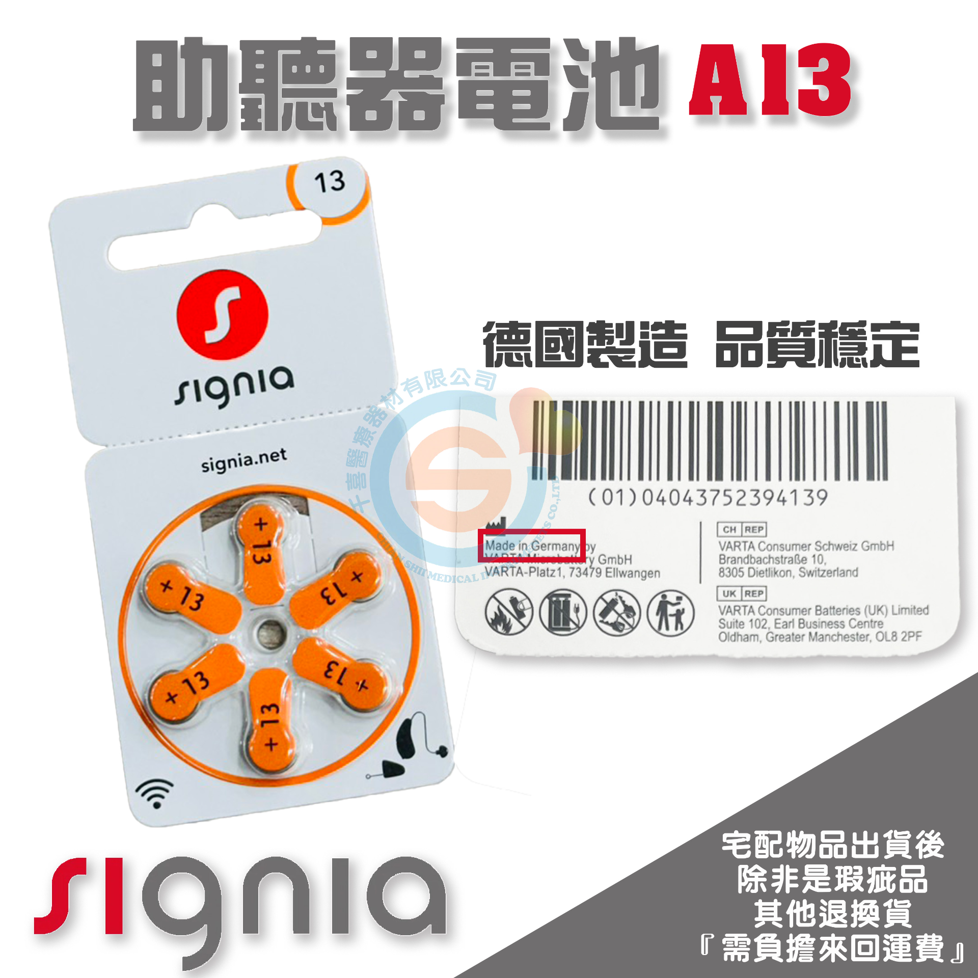 SIGNIA 德國 西嘉 原廠助聽器電池 鋅空氣電池 德國製 A13 (6顆/排)