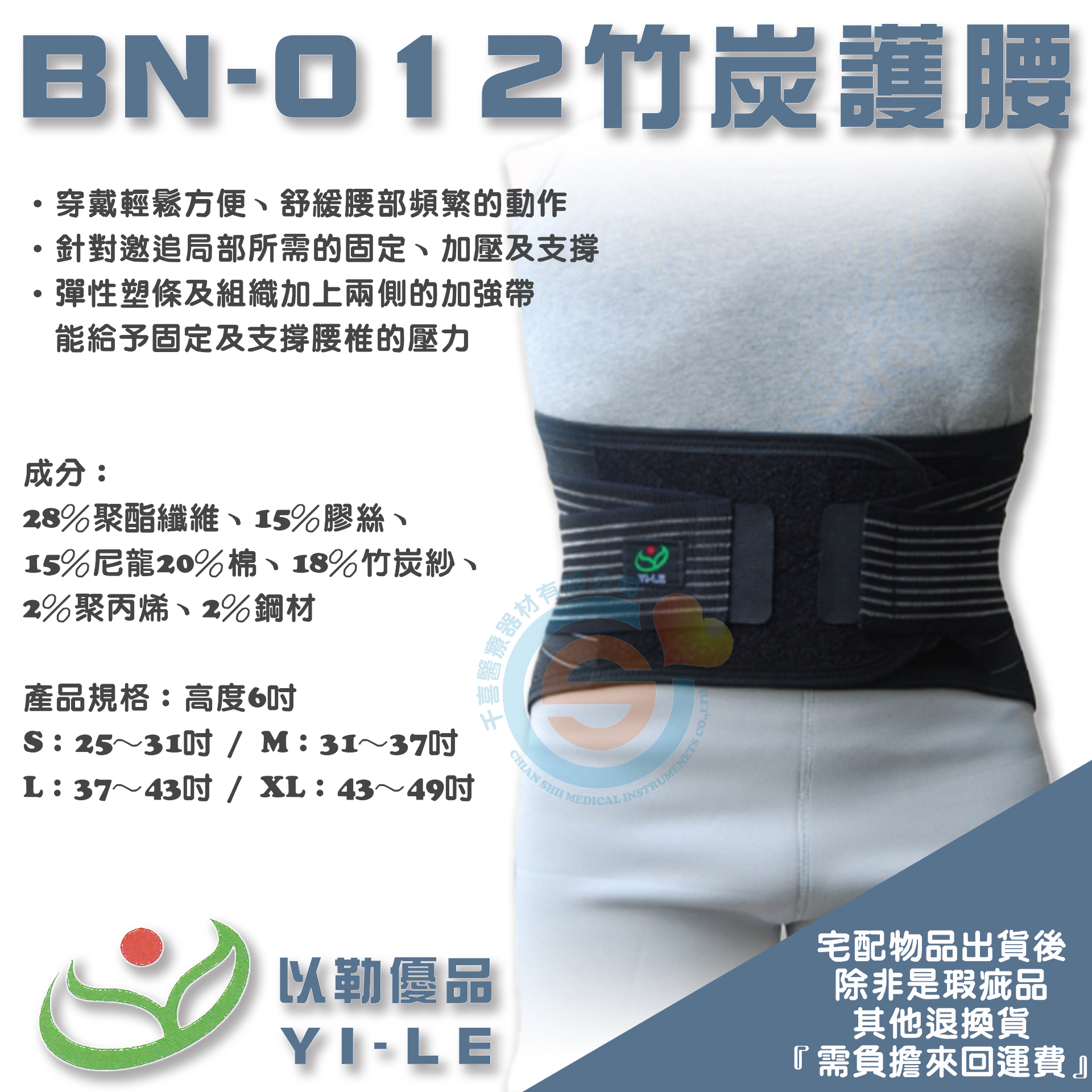 YI-LE 以勒優品 BN-012針織竹炭腰帶6吋 久坐 久站 搬重物 護腰 腰部支撐 腰部保健 運動護具 台灣製造