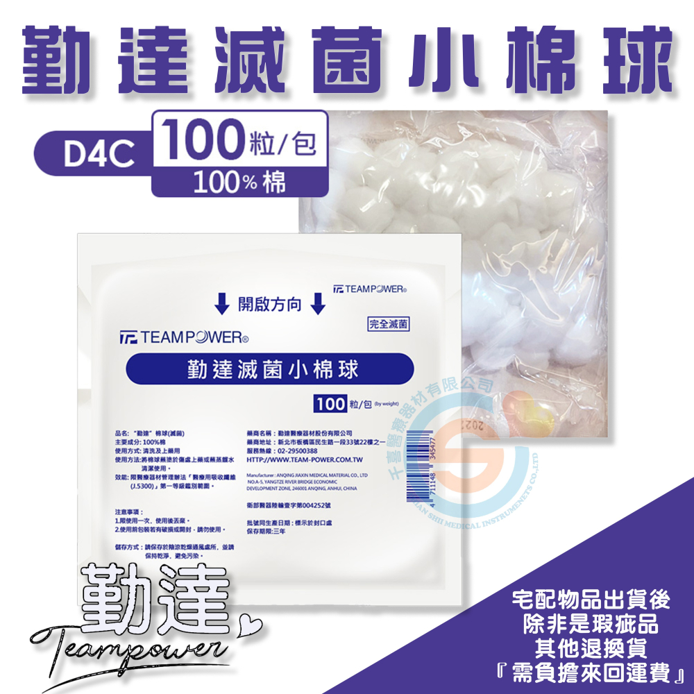 TEAMPOWER 勤達 滅菌小棉球 100粒/包 醫用吸收纖維 棉花纖維製成 吸收液體 表面塗藥 吸收液體