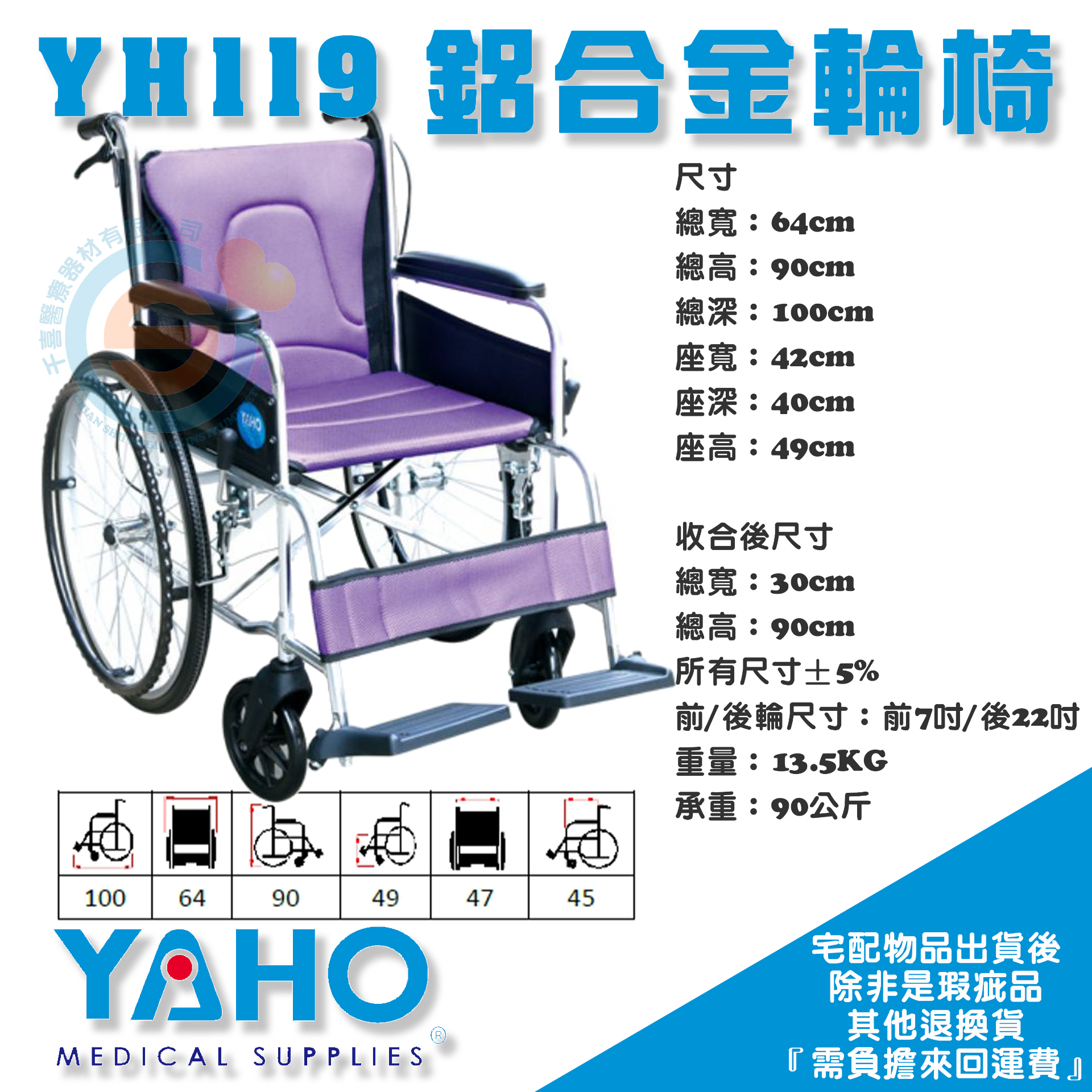 YAHO耀宏 YH119 鋁合金輪椅 輕量型輪椅 折疊式輪椅 外出輪椅 經濟型輪椅