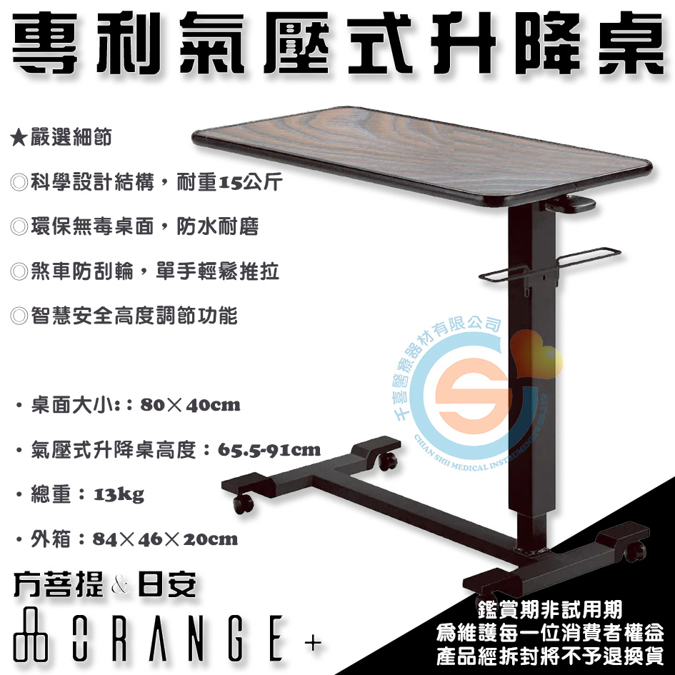 Orange+ 悅康品家 日安 方菩提 專利氣壓式升降桌 床旁桌 床旁升降桌 床旁氣壓式升降桌 千喜醫療 台灣製造