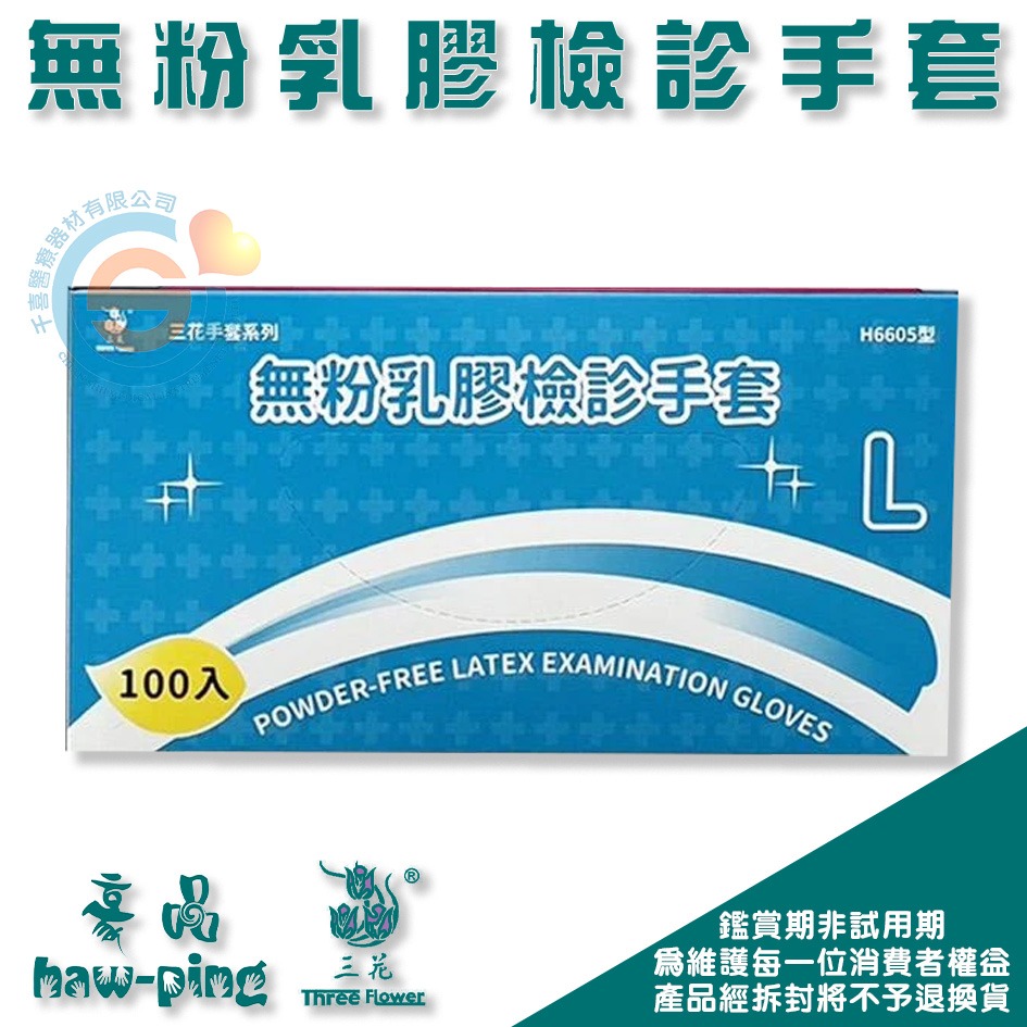 豪品 三花 花朵手套 H6605型 三花無粉乳膠檢診手套L 天然乳膠手套 醫療用手套 無粉手套 千喜醫療 10盒/箱
