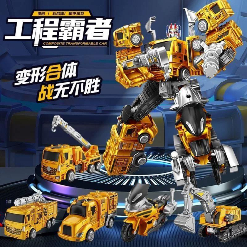 ☆玩具先生☆5合1工程霸者~吊車.水車.消防車.挖土機.吊車.摩托車.機車機器人