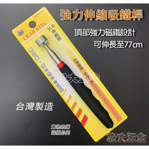 內容物:Crab King 強力伸縮吸鐵桿*1件 規格: 未伸長前18cm , 伸長後77cm 特色: 磁吸重量約1.5KG 產地: 台灣製 全新公司貨