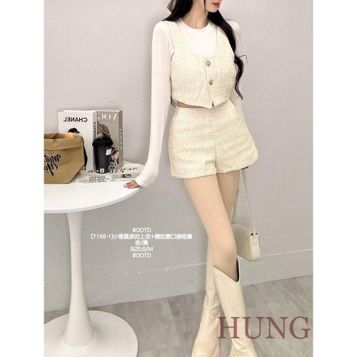 🅷🆄🅽🅶韓系熱門小香風排扣上衣+側拉鍊口袋短褲